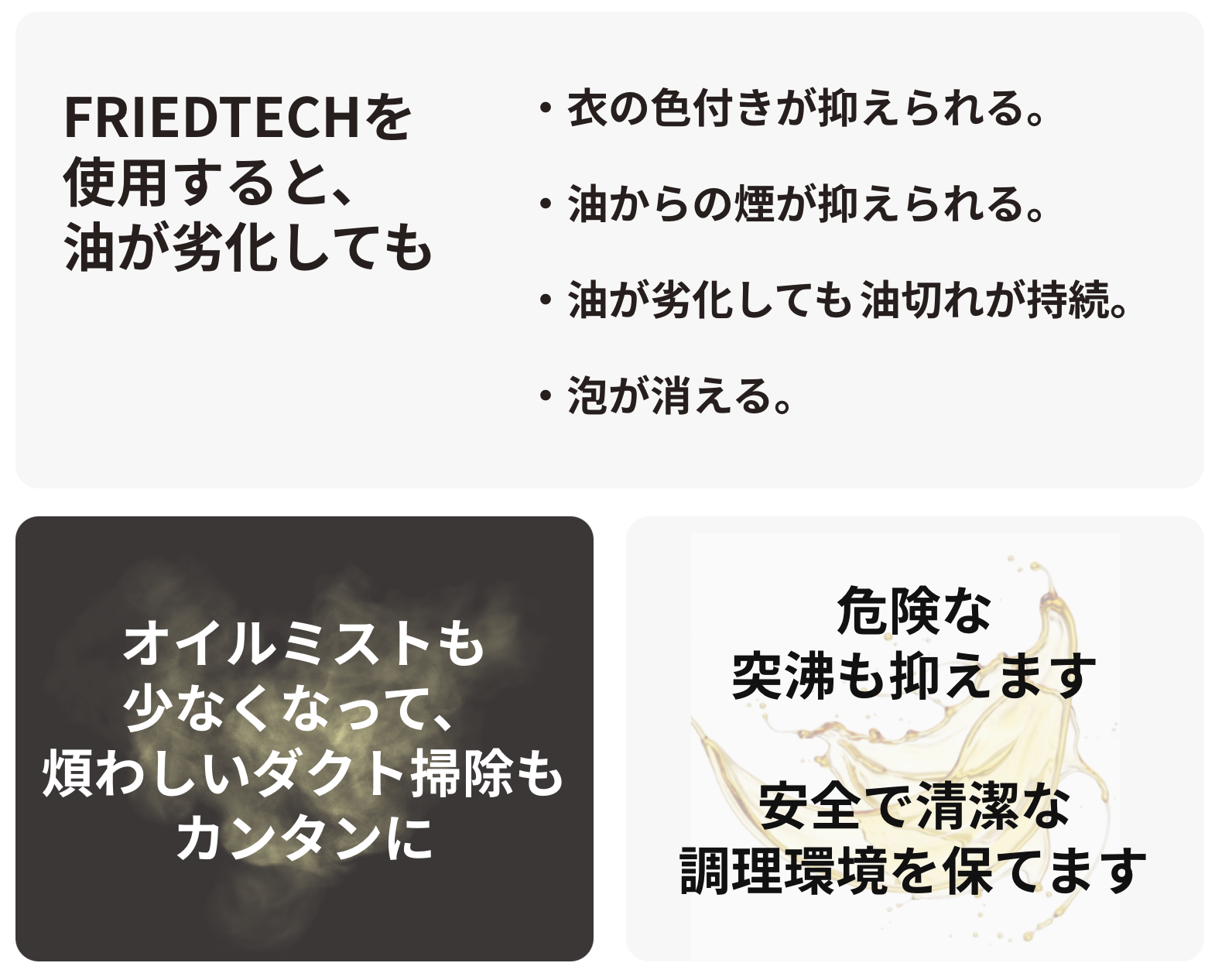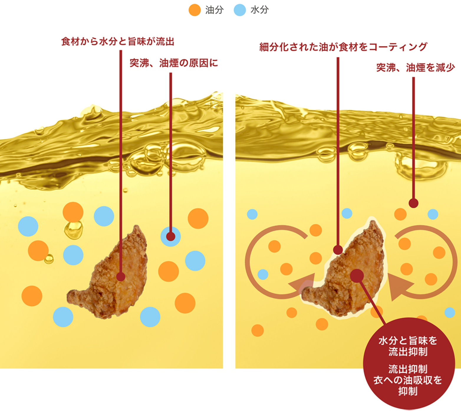 油の粒子を細かくする独自テクノロジーで、食材への油の吸収と劣化を抑え、揚げ物の油の使用量が約半分に削減できます。