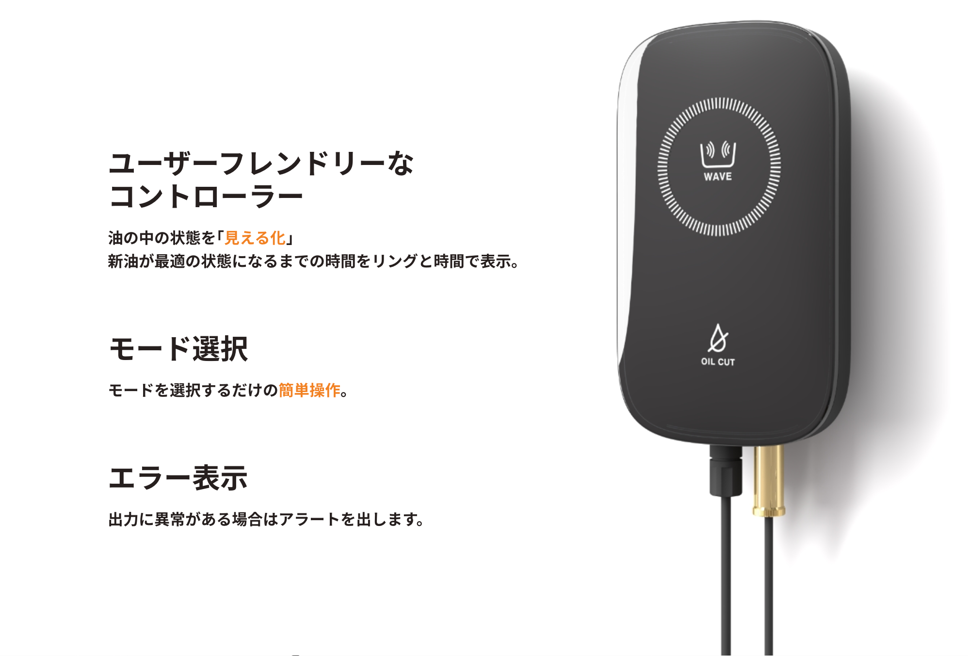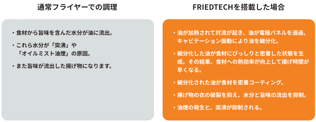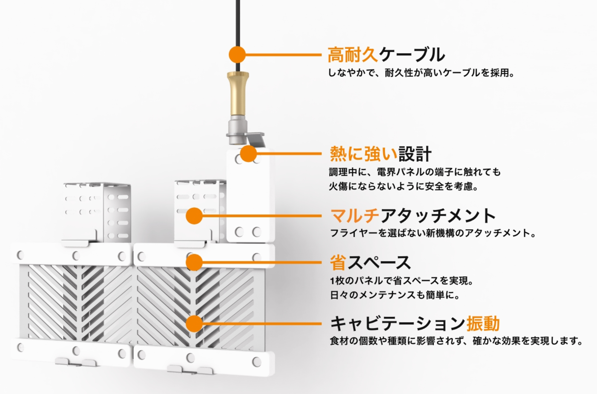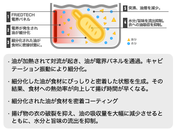 電界とキャビテーション効果※1で、油の使用量を半分近く減らし※2、揚げ物の旨味を最大限残し美味しくさせる斬新なデバイスです。