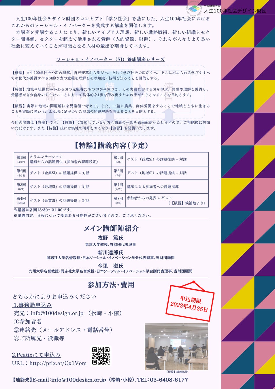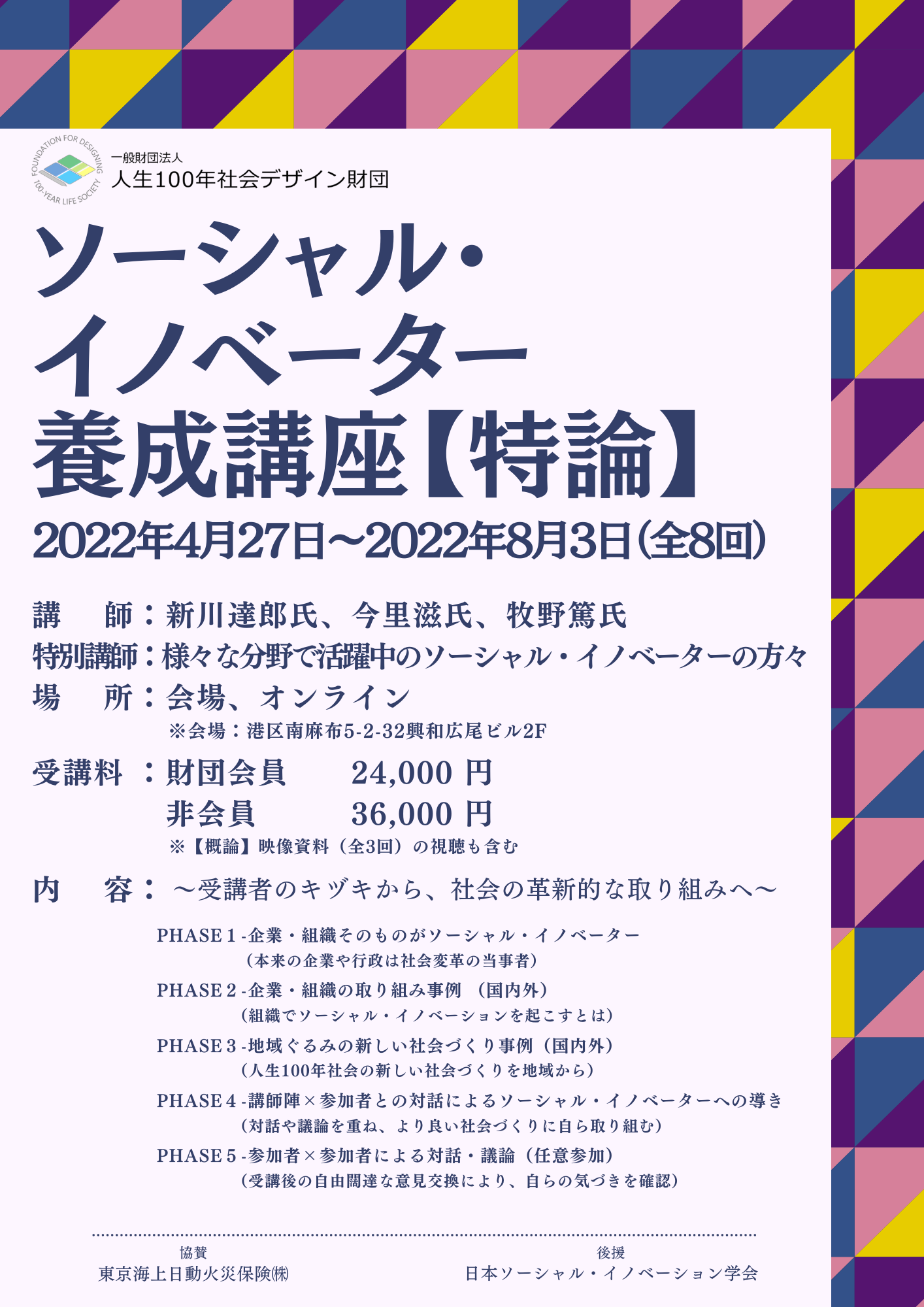 財団のコンセプト「学び社会」を基にした、人生100年社会におけるこれからのソーシャル・イノベーターを養成する講座を開催します。