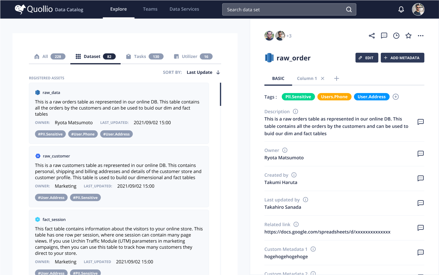 上記などのメタデータをカタログ上で、社内の誰もが参照可能な状態を実現します。データアナリストからデータエンジニアまで、さまざまなロールがコラボレーションを行う起点となり、データ利活用を促進することができます。