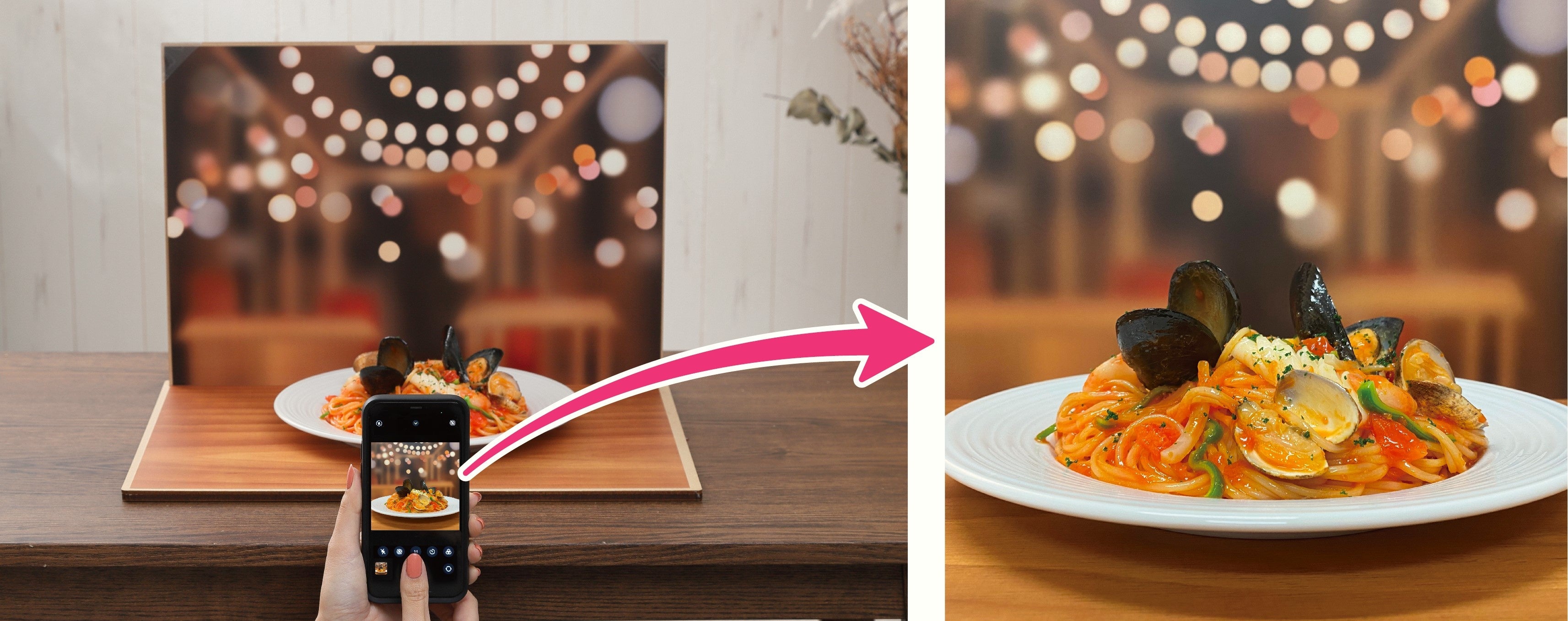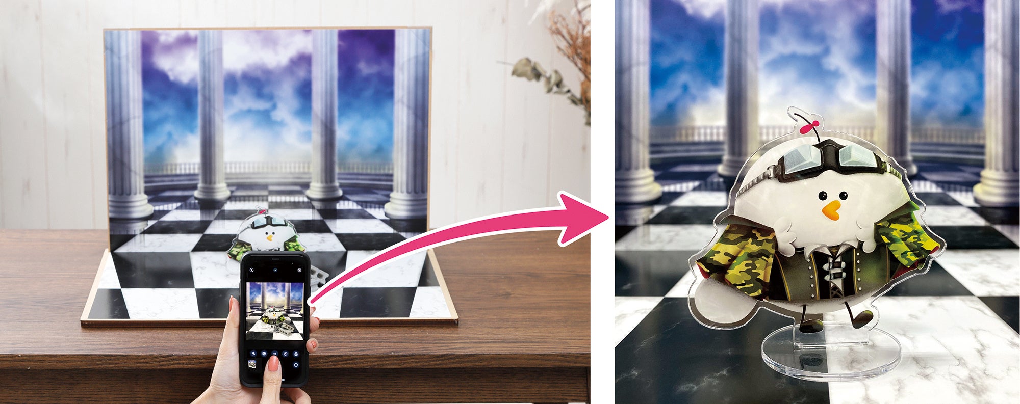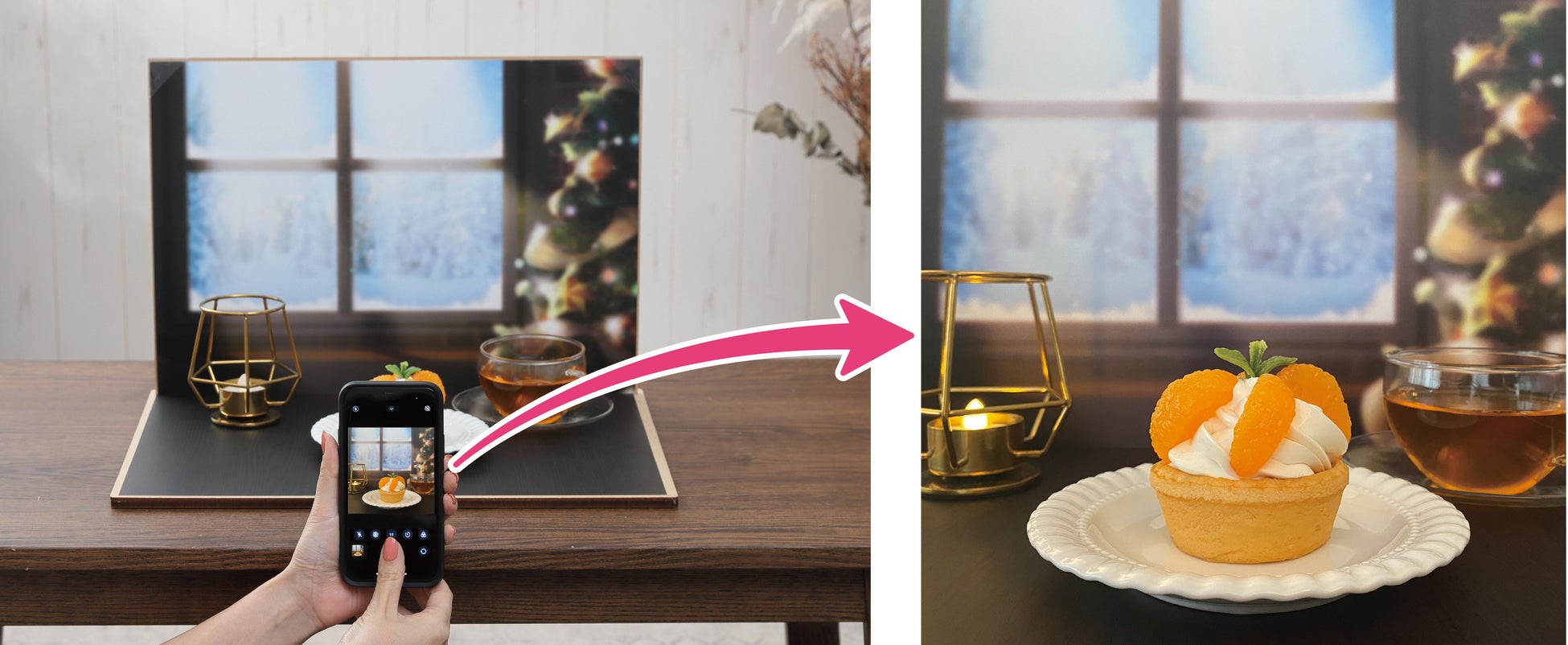 トリックアートで出来た2枚のデザインシートを取り付けることで奥行き感を出し、カメラのファインダー越しに見ることで、1つの完成した世界観が生まれ、そこに小物を置いて撮影することで”映え写真”が撮れる、と言う小物用撮影ブースです。(特許取得済み)
