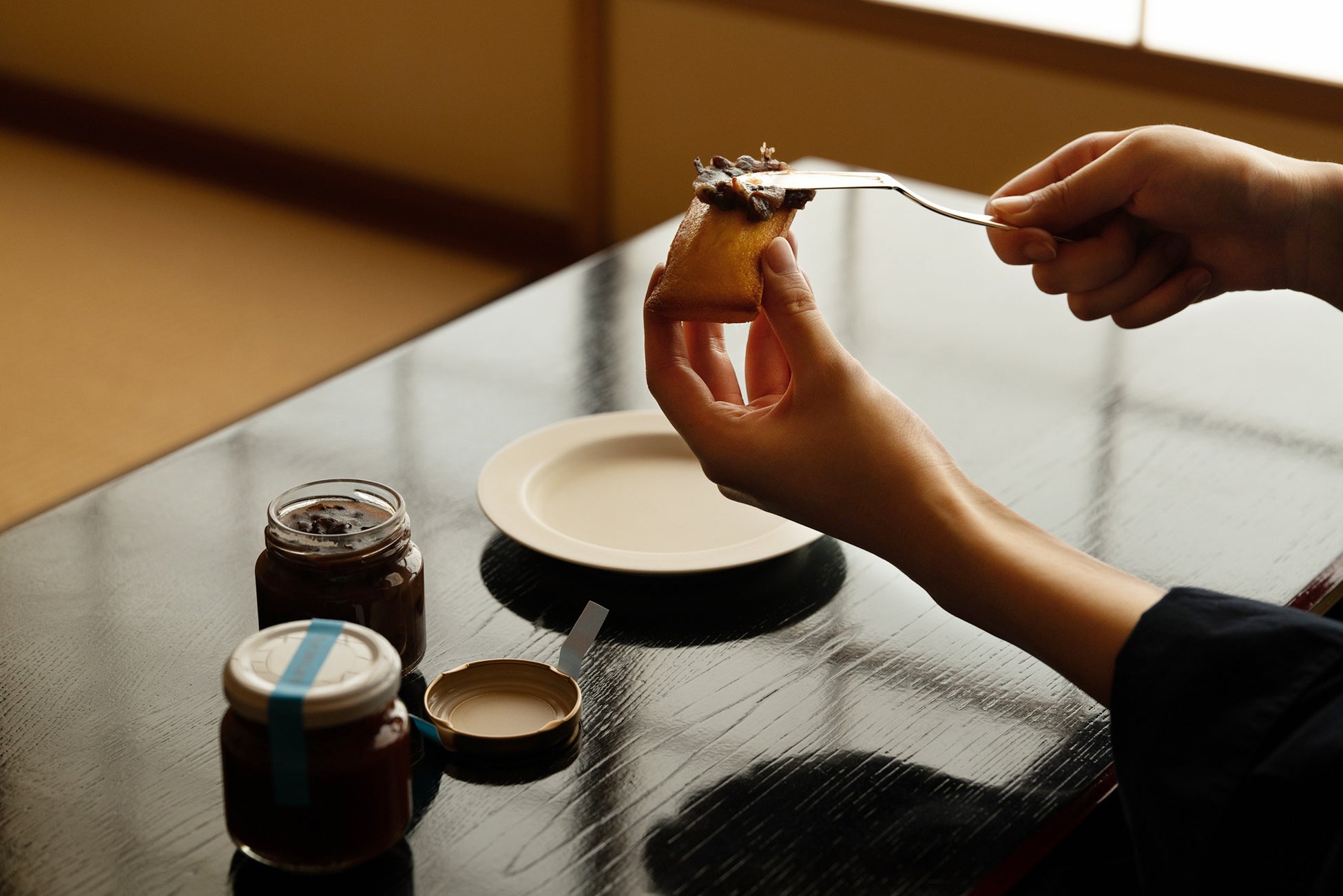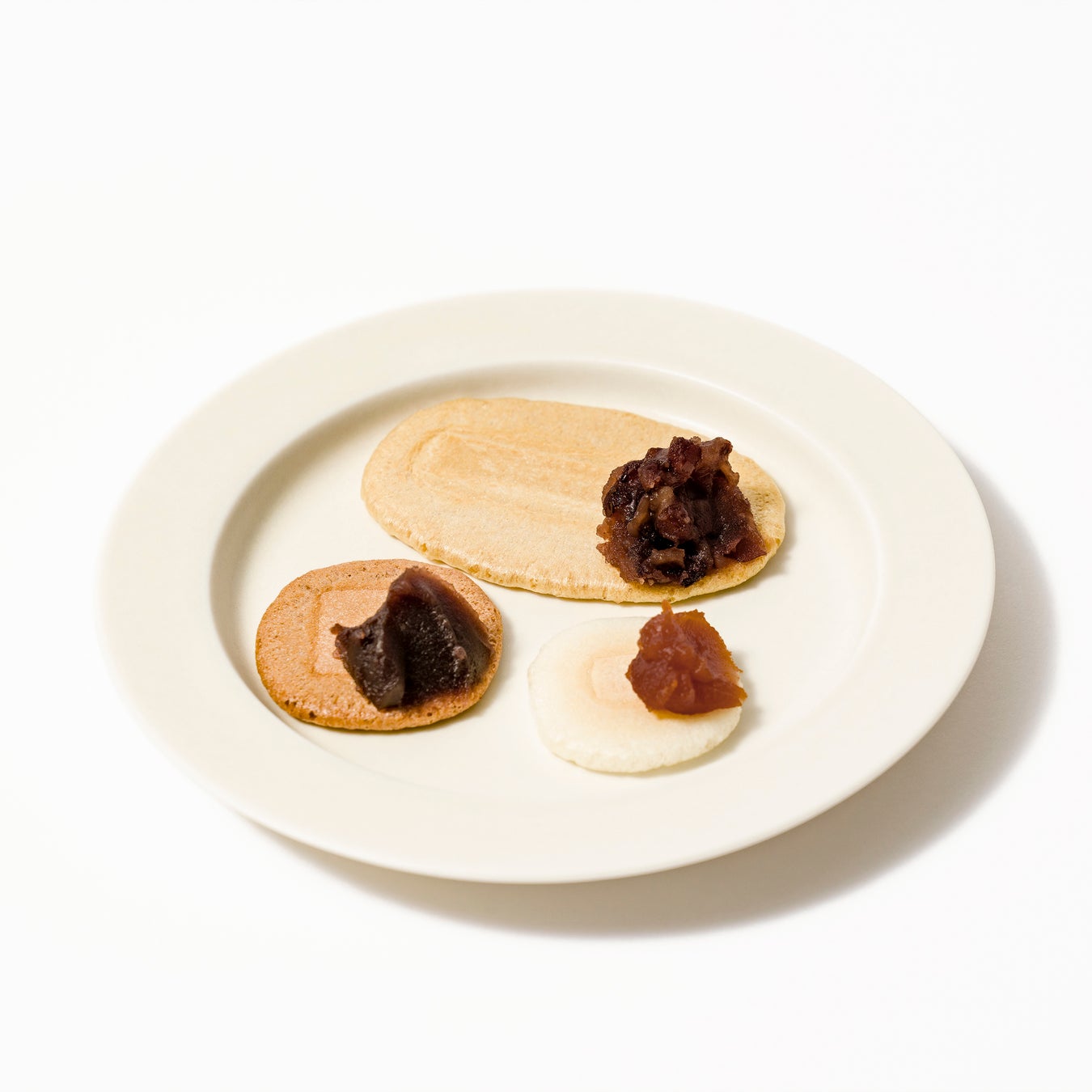 大きさや食感、風味の異なる三種類の麩焼きせんべいに、AoQこだわりのあんをたっぷり乗せてお楽しみください。アイスクリームを乗せるのもオススメです。あんこの代わりにキャビアやイクラなどを乗せていただくと和風カナッペとしてもお楽しみいただけます。