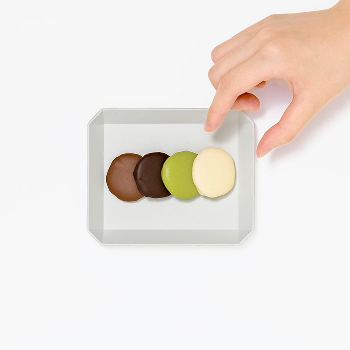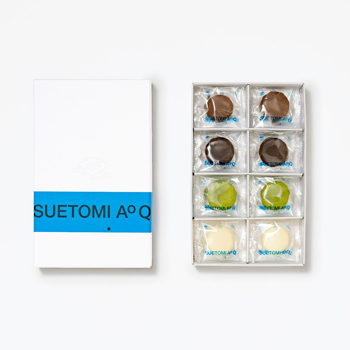 AoQでは直径3センチほどの小さくてまんまるい麩焼きせんべいを四種(ミルク・ダーク・ホワイト・抹茶)のチョコレートで包みました。驚くほど軽い食感とほんのり香るお米の香りが特長で、お茶やコーヒーだけでなく、シャンパンなどと合わせていただくのもオススメです。