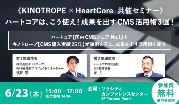 Web制作を行う株式会社キノトロープ(所在地:東京都渋谷区、代表:生田昌弘)は、企業のWeb担当者を対象とした無料オンラインセミナー「ハートコアは、こう使え!成果を出すCMS活用術3選!」を6月23日(木)に実施します。