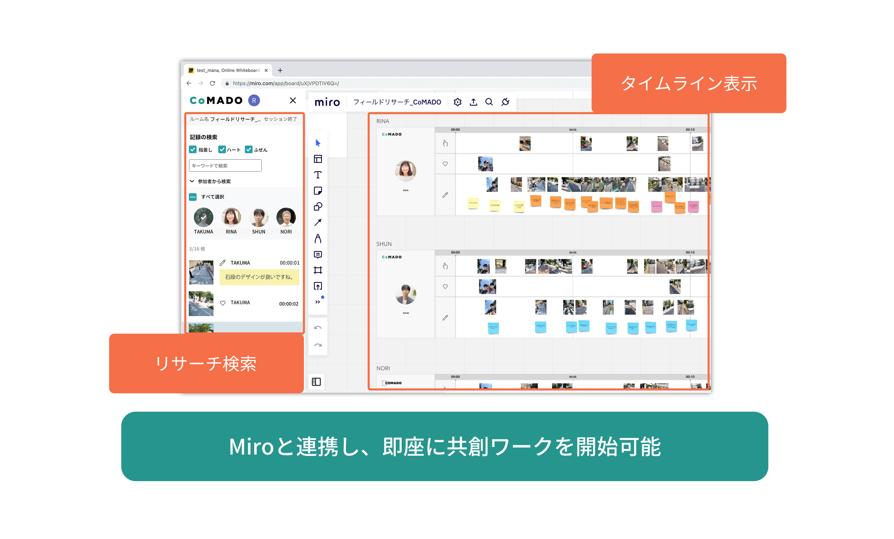 CoMADOは、オンラインホワイトボードMiroと連携し、リサーチ後の共創ワークまで一気通貫で実施ができます。リサーチの記録は、Miroボード上に全てタイムラインに自動で配置されます。リサーチ直後にMiroボードを開くだけで、すぐに共創のワークを開始することができます。また、リサーチの記録の検索も可能です(指差し・ハート・ふせんなどの記録形態、参加者名、キーワードで検索可能)。CoMADOは、洞察の共有や整理、洞察を活かしたアイデア発想等、リサーチ後の共創体験までも、トータルで提供するツールです。