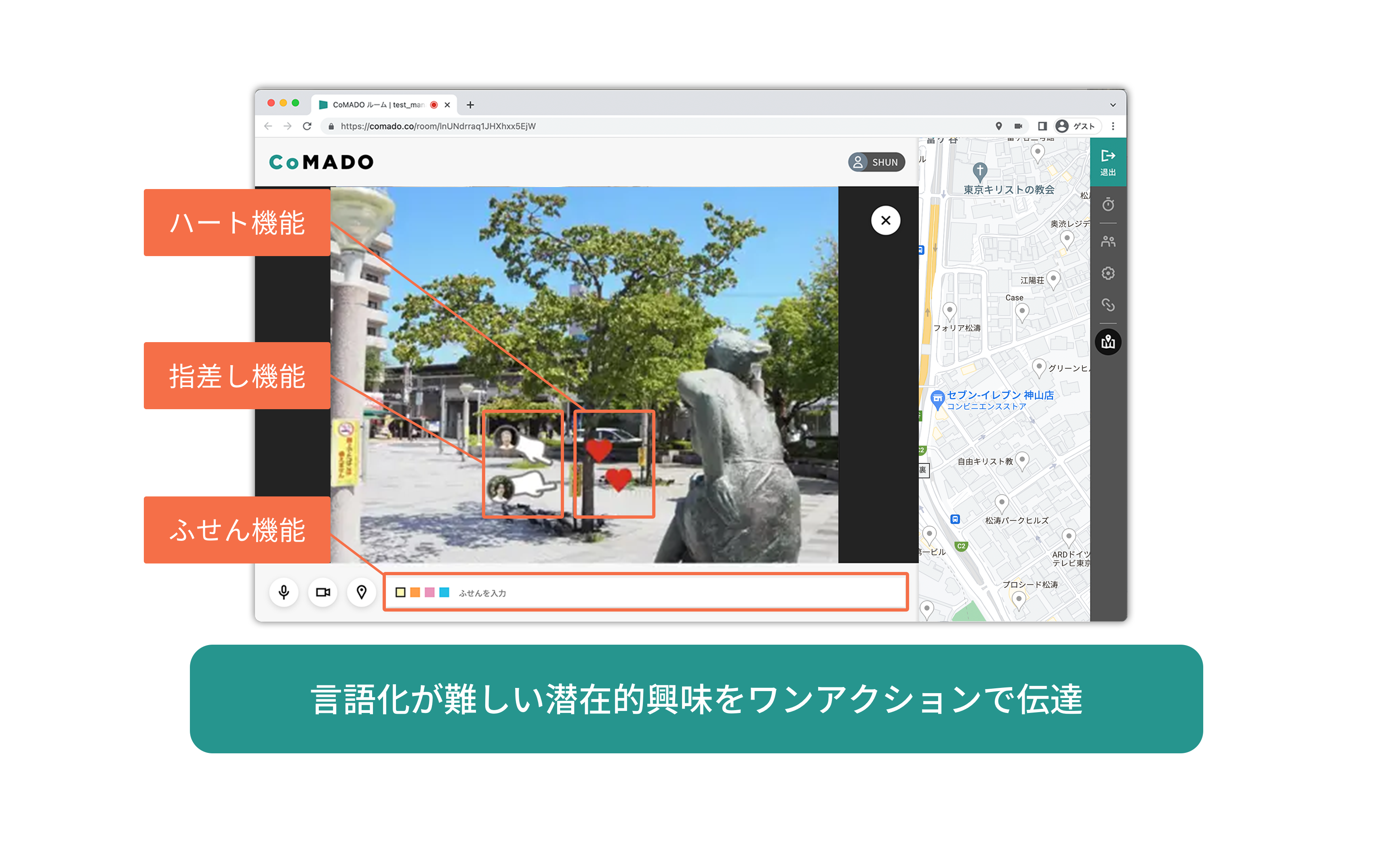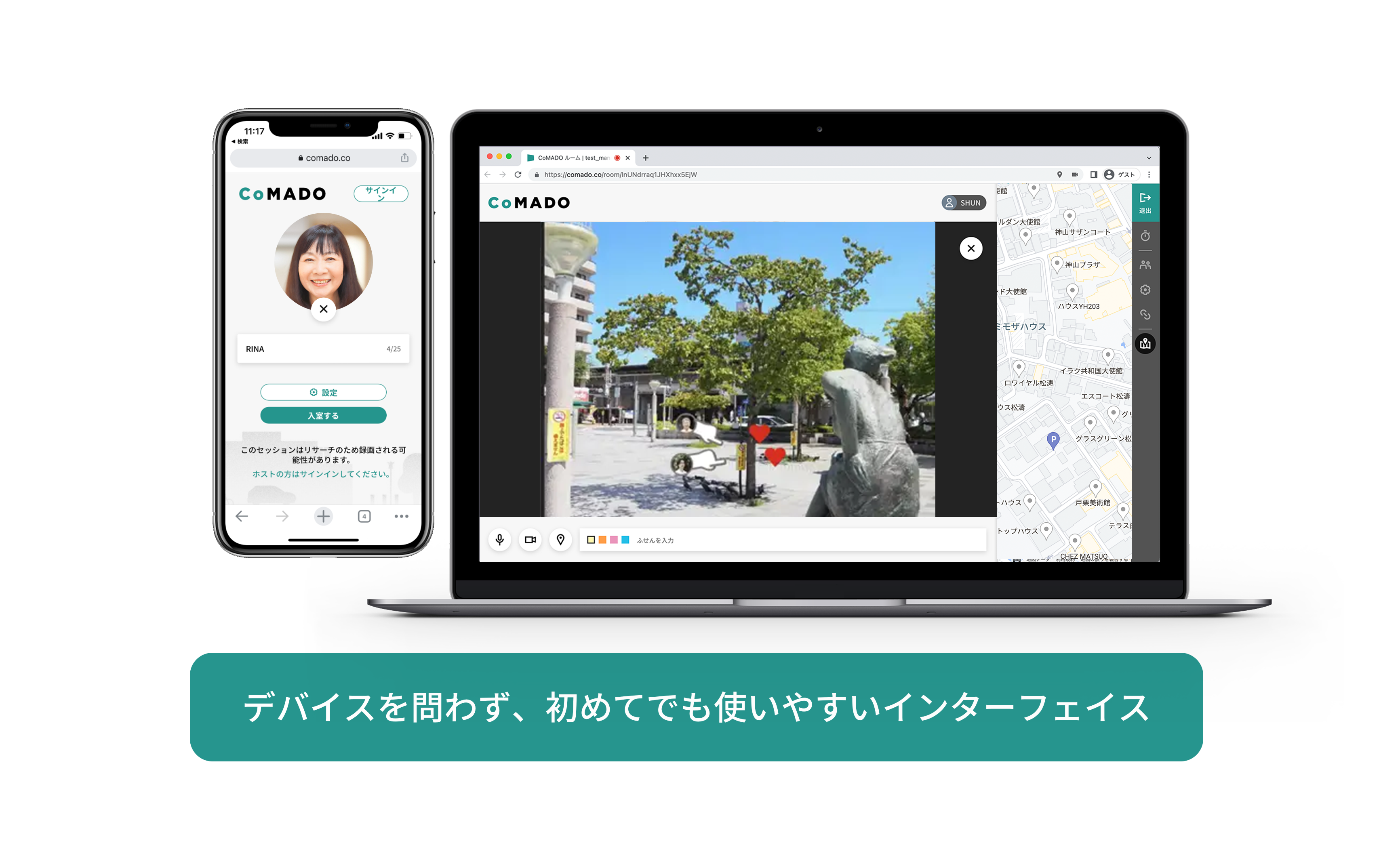 ルームURLをクリックするだけで、PCやスマホ・タブレットのブラウザから誰でもすぐにCoMADOに参加できます。プレゼンターの中継画面では、クリック、長押しのアクションで誰でも簡単に興味関心を示すことができます。プレゼンターの位置情報を地図上で確認したり、ふせんへのメモ記録など、わかりやすい操作で、使いやすい機能が準備されています。初めての方でも、子供もお年寄りも、幅広い年代の方にお使いいただけます。