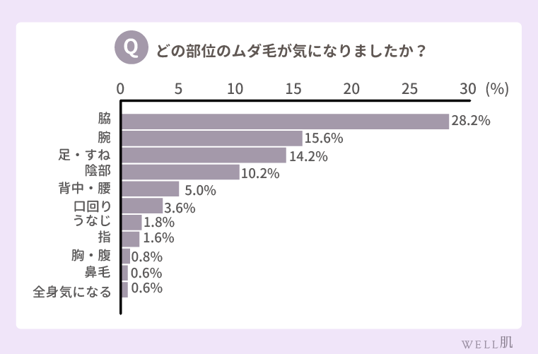 ムダ毛が気になった部位についての質問をすると、28.2%の方が「脇」と回答しました。