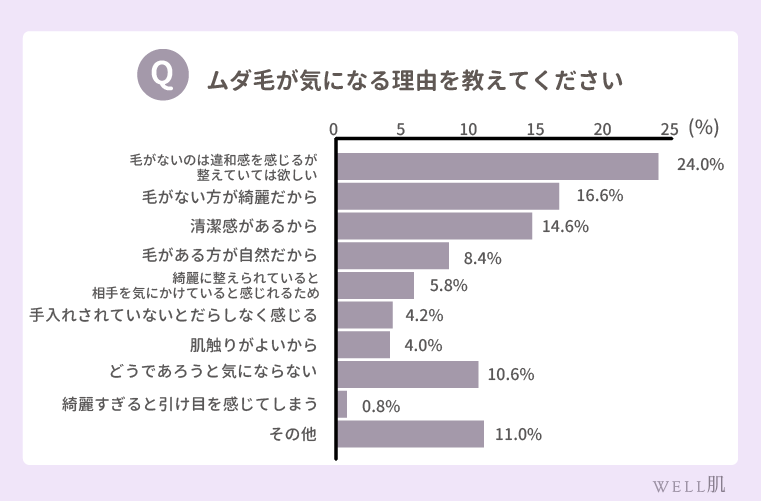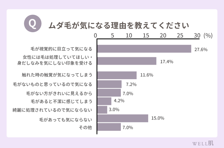 DSクリニック(https://dsclinic.jp/)が運営する脱毛情報メディアWELL肌(https://dsclinic.jp/media/)では、女性のムダ毛に関するアンケート調査を実施いたしました。