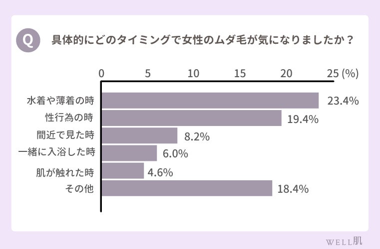 女性(パートナー)のムダ毛が気になったタイミングについての質問では、23.4%の方が「水着や薄着の時」と回答しました。