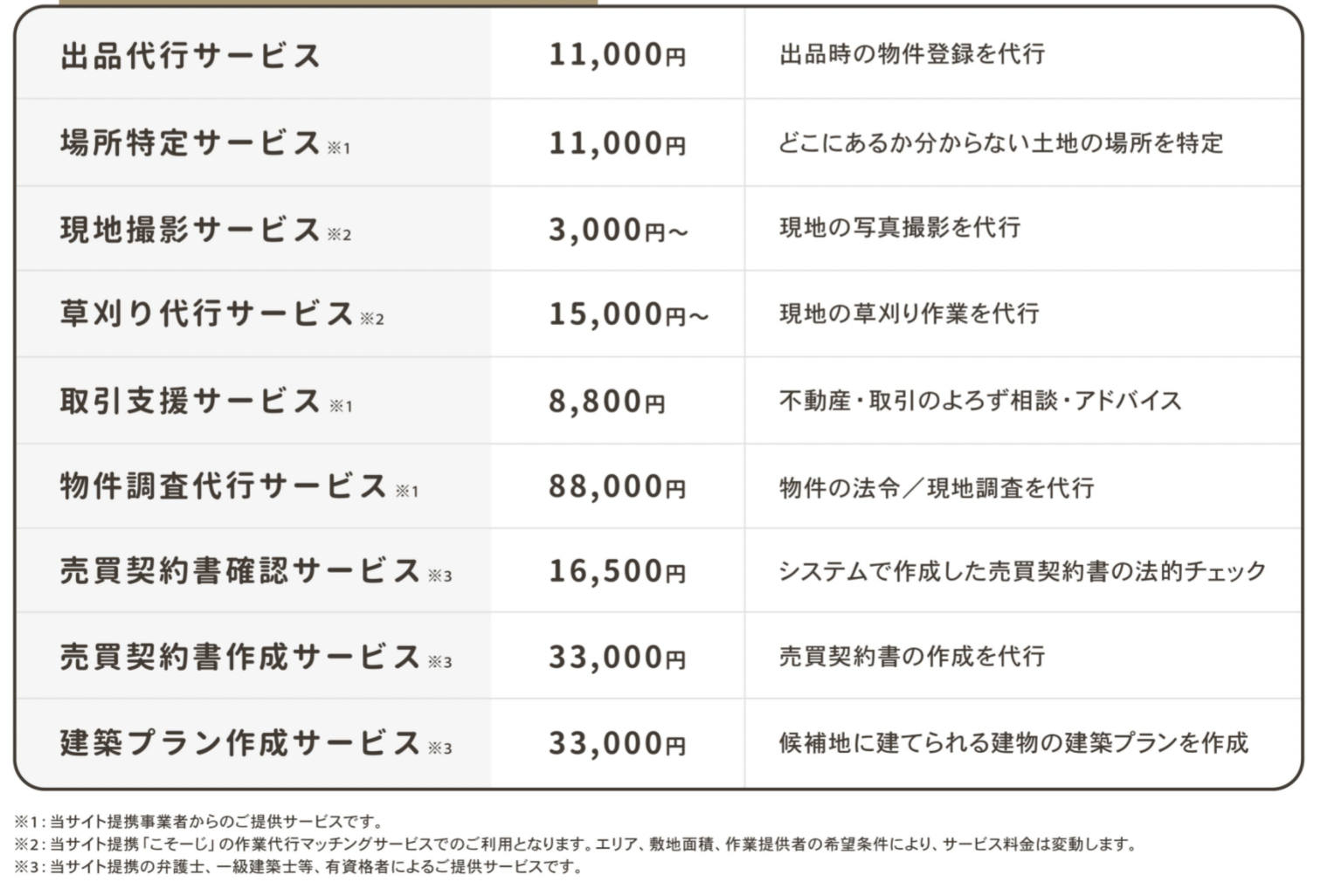 ※撮影代行オプション/草刈り代行オプションについては、Rsmile株式会社と提携し、同社が運営する、不動産管理マッチングサービス「こそーじ」により、全国の遊休地の撮影や、草刈り作業の代行を行います。