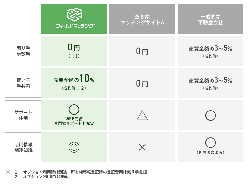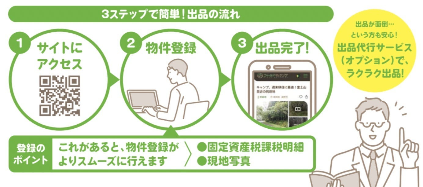 フィールドマッチングは、空き地・空き家、余っている土地などの「遊休地」を、個人間取引を実現するプラットフォームです。個人間での不動産売買が、気軽に0円から行うことができます。