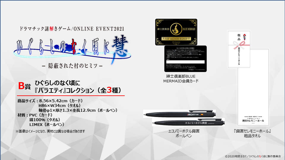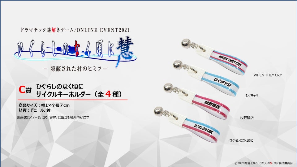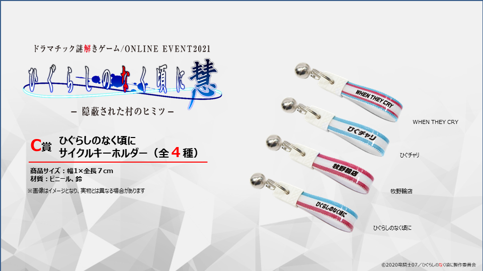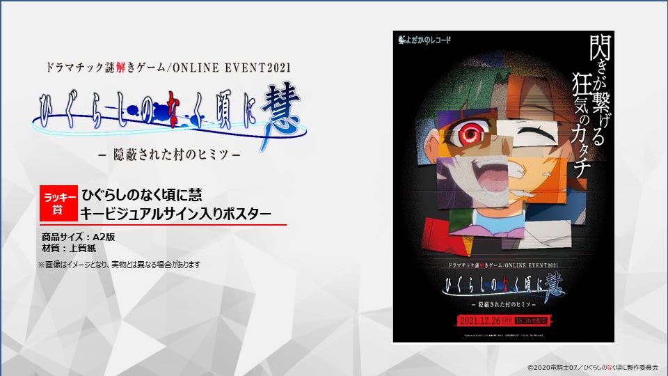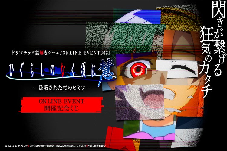 ひぐらしのなく頃にオンライン謎解き実行委員会は、『ドラマチック謎解き/ONLINE EVENT2021ひぐらしのなく頃に慧-隠蔽された村のヒミツ-』の開催を記念し、「ONLINE EVENT開催記念くじ」の販売を、楽天グループ株式会社(本社:東京都世田谷区)が運営する限定グッズオンラインショップ「楽天コレクション」にて12月22日(水)15:00より販売開始いたしました。