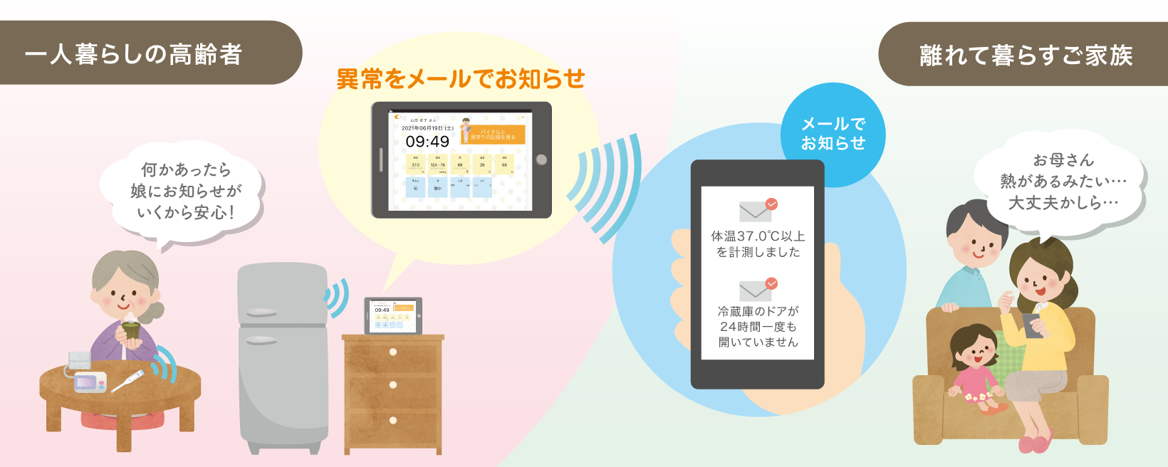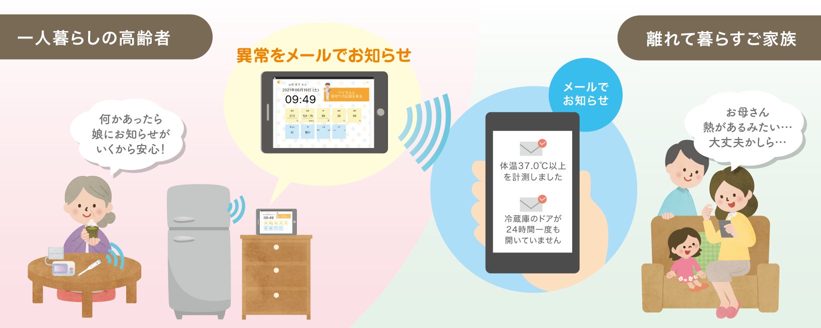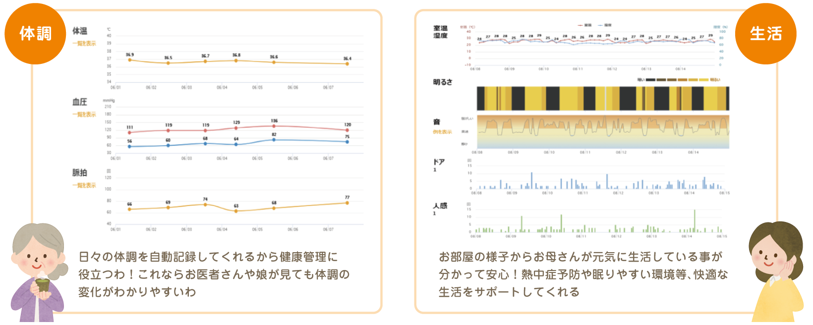 「ケアデータコネクト ホーム」は自宅に設置した機器からバイタル情報と生活の様子を自動的に収集し、インターネットを利用して介護事業者やご家族にグラフやアラートの形で提供します。
