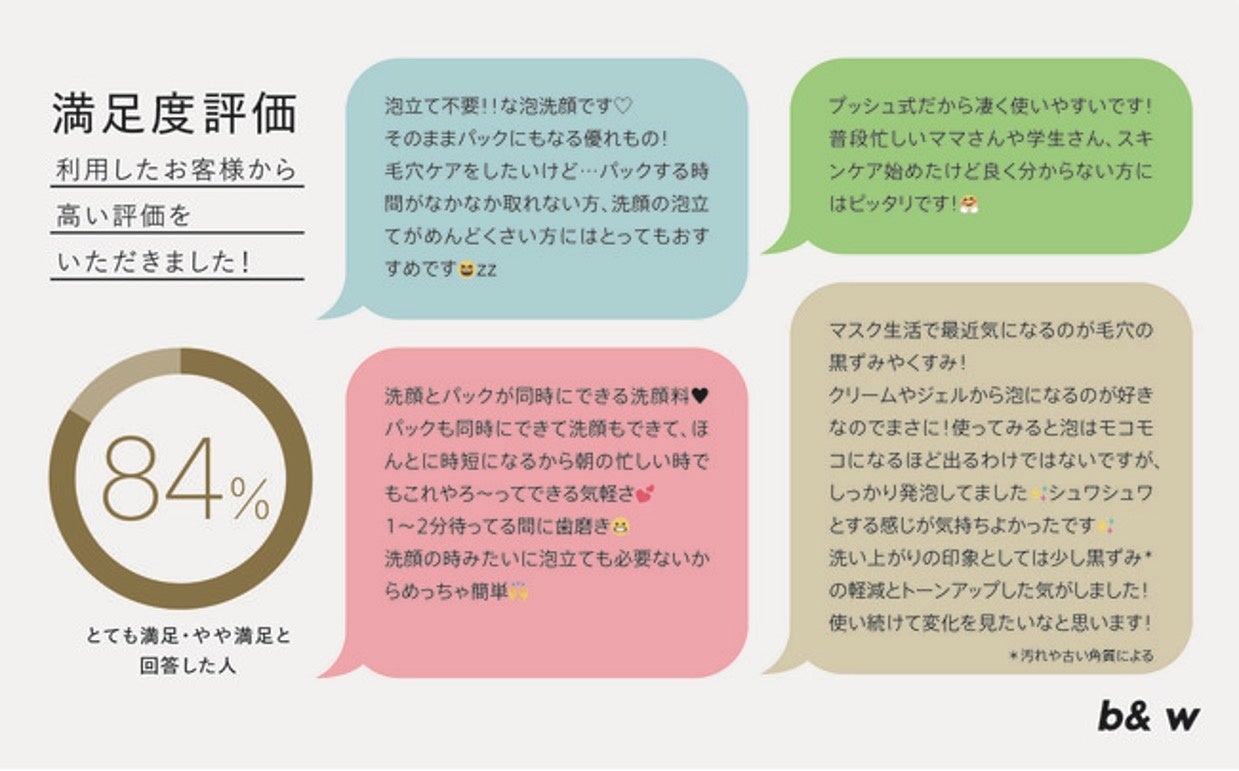 実際の利用した方へのアンケート結果では、総合満足度84%という高い評価を得られました。他にも肌への刺激への満足度(84.2%)、洗い上がりのつっぱらなさ(84.2%)と、毎日使う洗顔に求めたいポイントの満足度も高い評価として現れています。