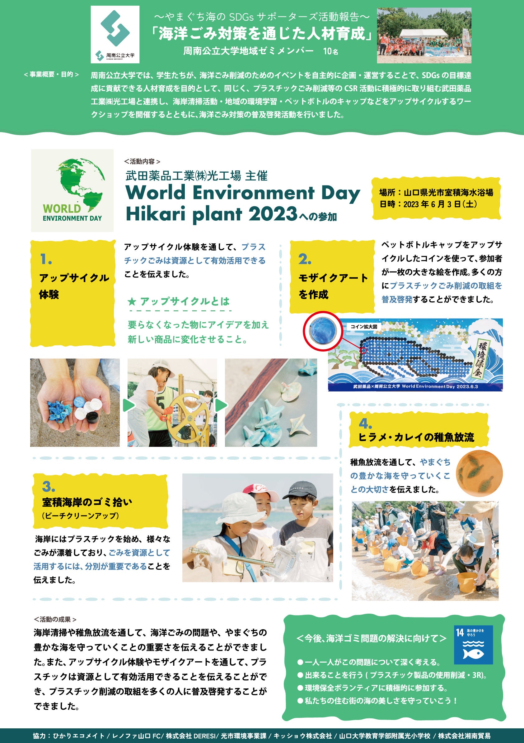 SDGsの目標達成に貢献できる人材の育成を目的として、プラスチックごみ削減等のCSR活動に積極的に取り組む武田薬品工業㈱光工場と連携し、海岸清掃活動、地域の環境学習、ペットボトルのキャップなどをアップサイクルするワークショップ等の海洋ごみ削減イベントをゼミ生が自主的に企画・運営して開催。