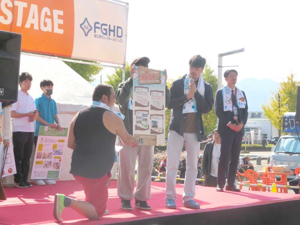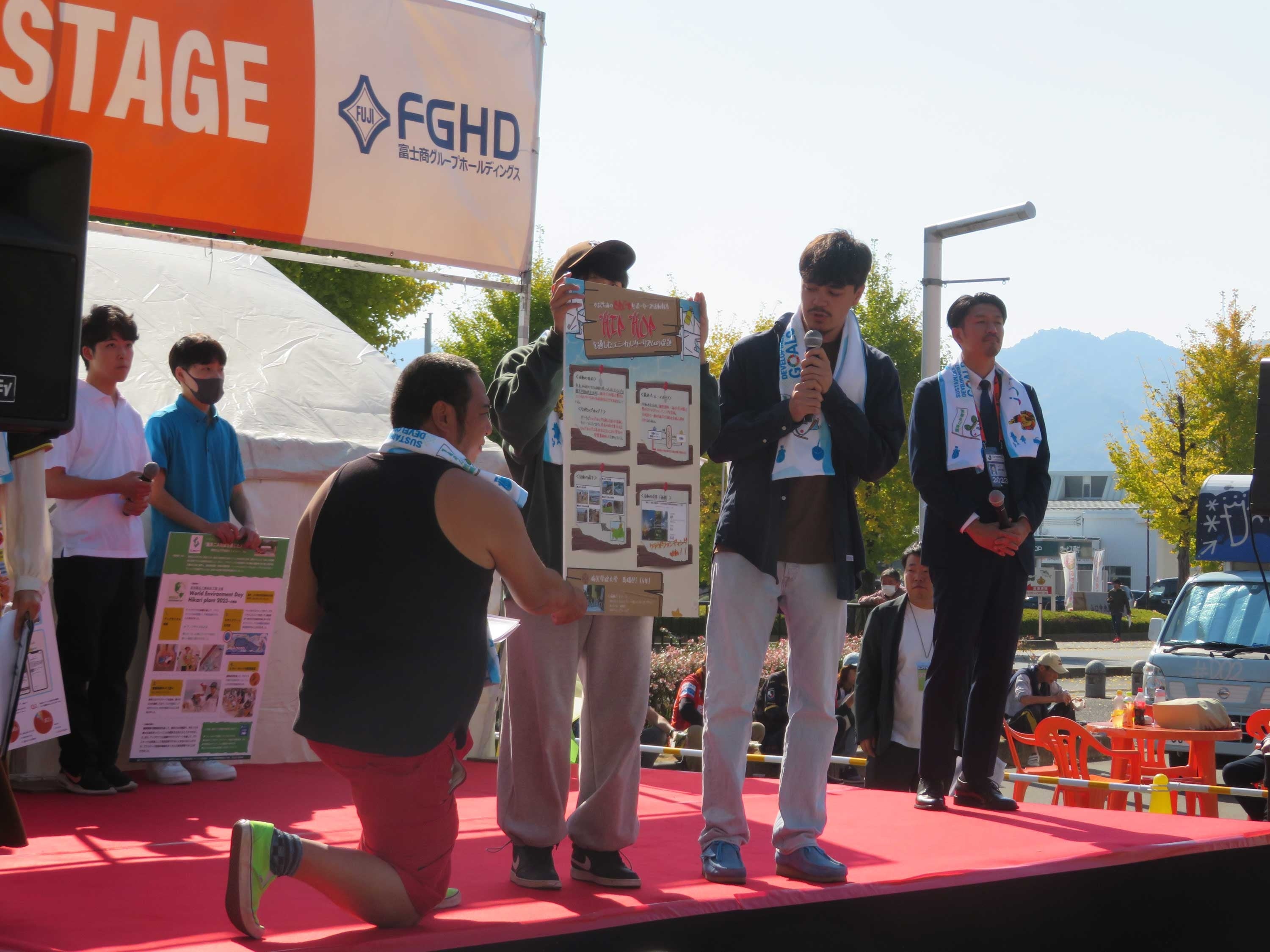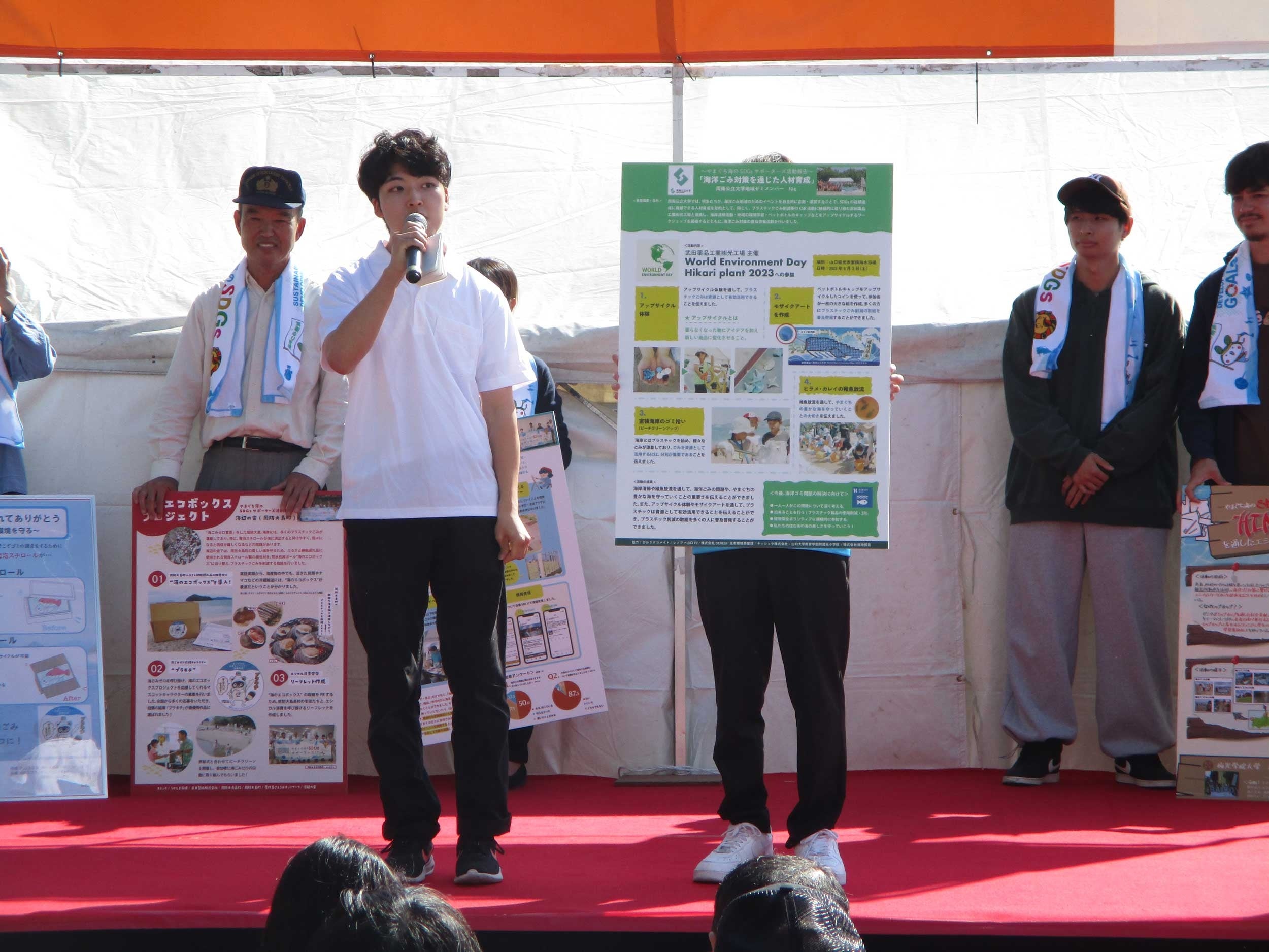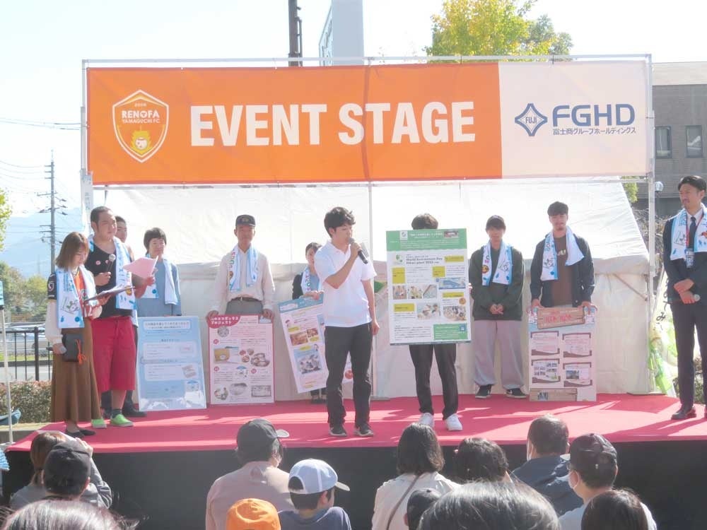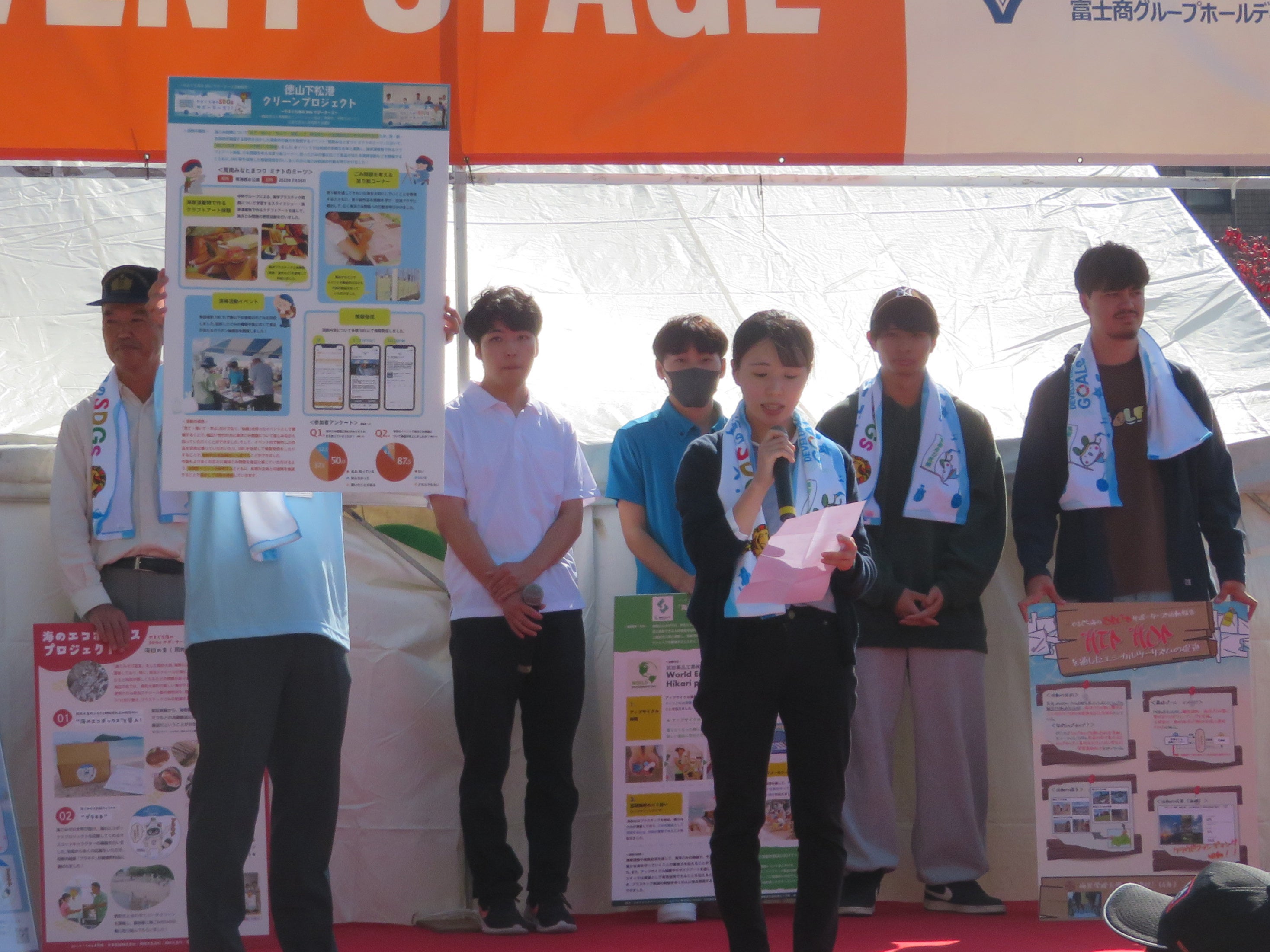 スタジアムの場外 イベント広場に設置された特設ステージにおいて、やまぐち海の SDGsサポーターズが、やまぐちの海や各地域 でこれまでに取り組んだ海洋ごみ対策などの成果を報告しました。