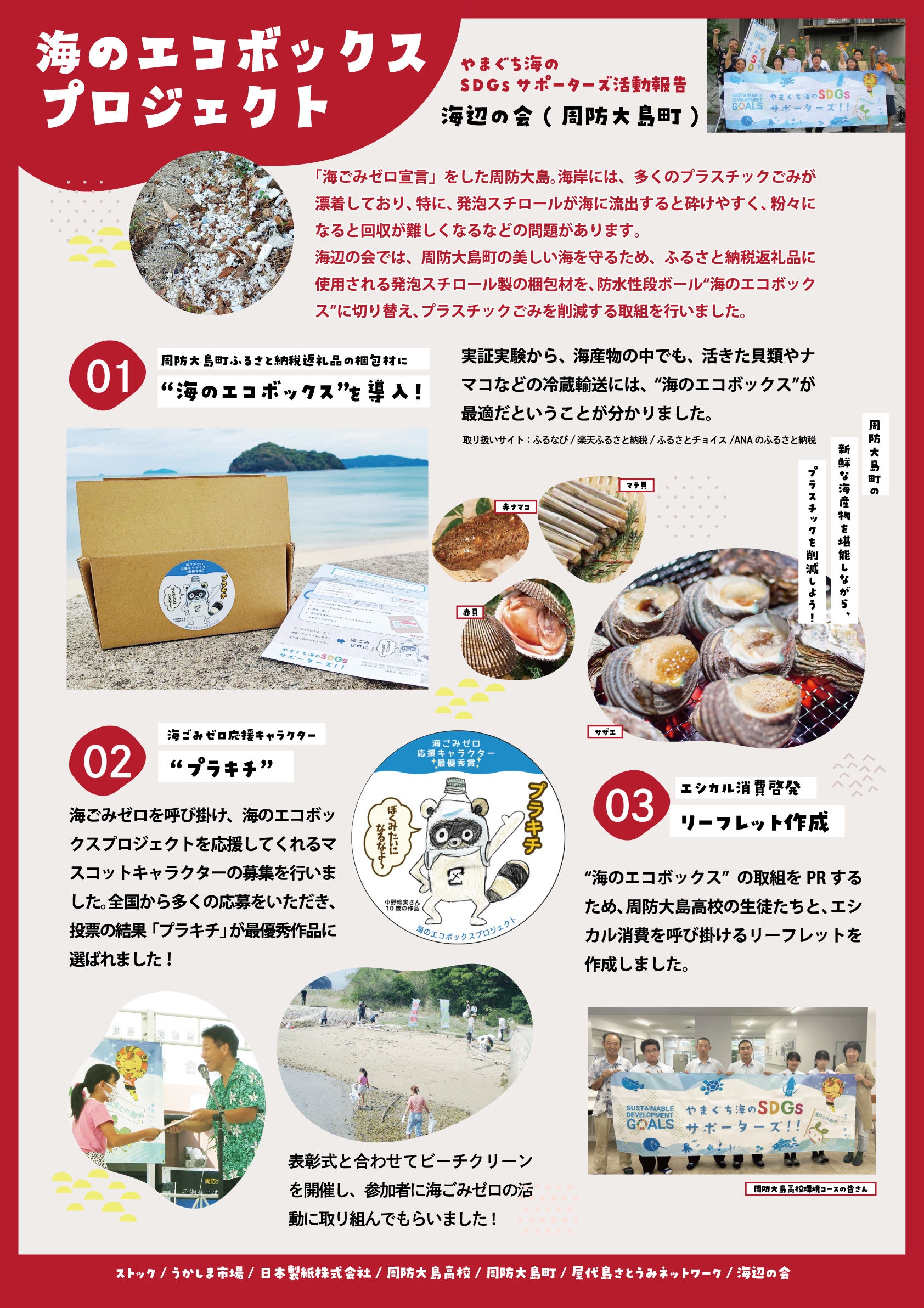 海岸に漂着するプラスチックごみを削減するため、周防大島町のふるさと納税返礼品に使用される発泡スチロール製の梱包資材を防水性段ボール「エコボックス」に切り替える取り組みを展開。取組を応援するマスコットキャラクター「プラキチ」や地元の周防大島高校の生徒が作成した啓発リーフレットを活用し、「海ごみゼロ宣言の町 周防大島町」を全国にPR。