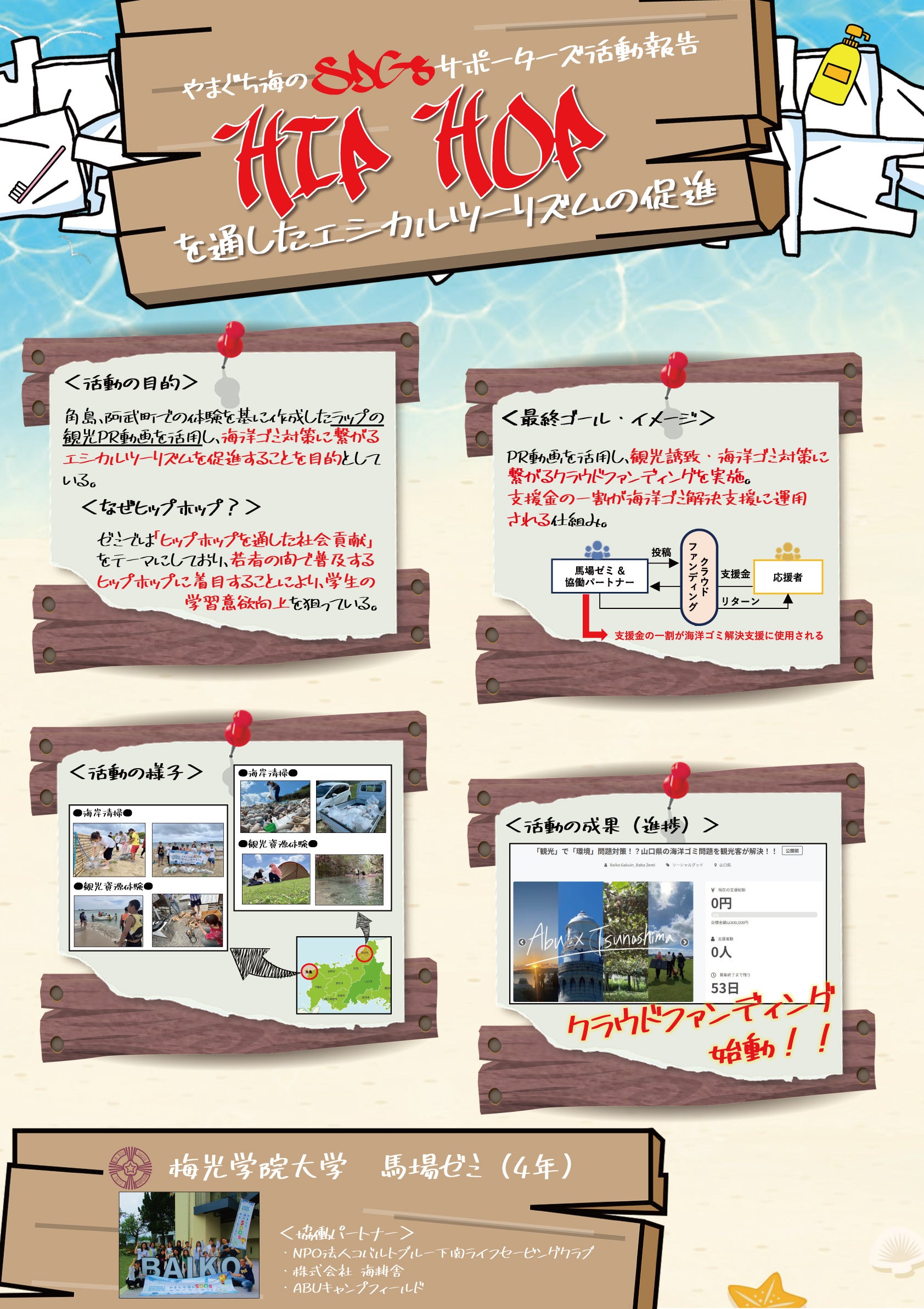 「 HIP HOPを通した社会貢献」をテーマにサービス・ラーニングに取り組む ゼミ生が、下関市角島の海を舞台にしたマリンアクティビティや阿武町でのキャンプ体験など、現地の観光資源を体感しながら海岸清掃活動に参加 。清掃活動や各地域での体験を基に、海洋ごみ問題を考え、観光を促進するラップ PR動画を作成し、観光誘致・海洋ごみ対策に繋がるクラウドファンディングを展開。