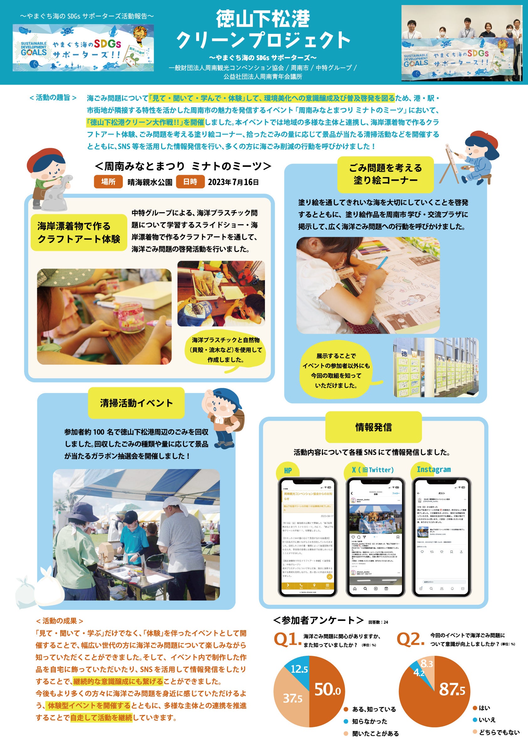 港と市街地が隣接する周南市の魅力を発信するイベント「周南みなとまつり ミナトのミーツ」において、徳山下松港の環境美化を図るため、「徳山下松港クリーン大作戦!!」を開催。清掃活動や海岸漂着物で作るクラフトアート体験、海洋ごみ問題を考える塗り絵コーナーなどを開設し、来場者に海ごみ削減の行動を啓発。