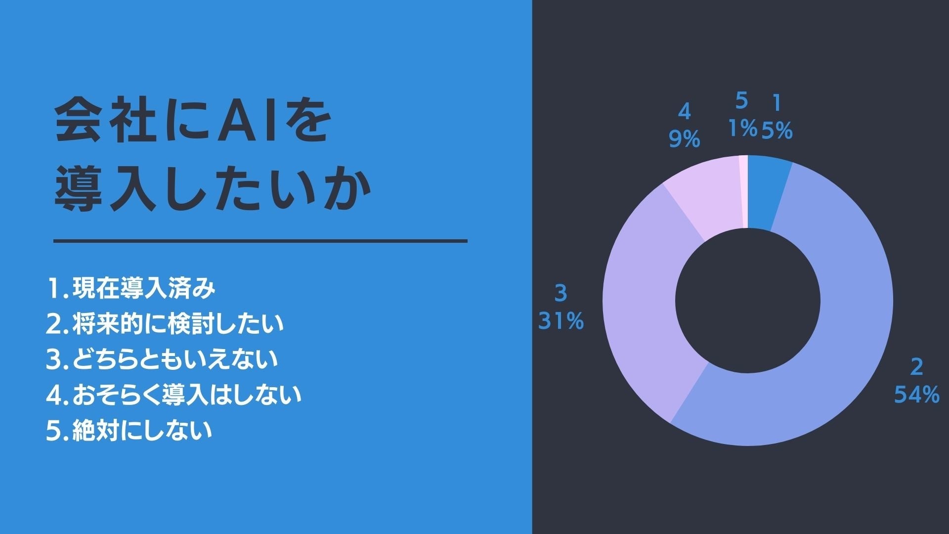 その一方で、会社にAIを導入したいか?との質問に対しては、将来的に検討したいと回答した企業は全体の54%となっており、AI導入に対して興味を示している企業が多いことがわかります。