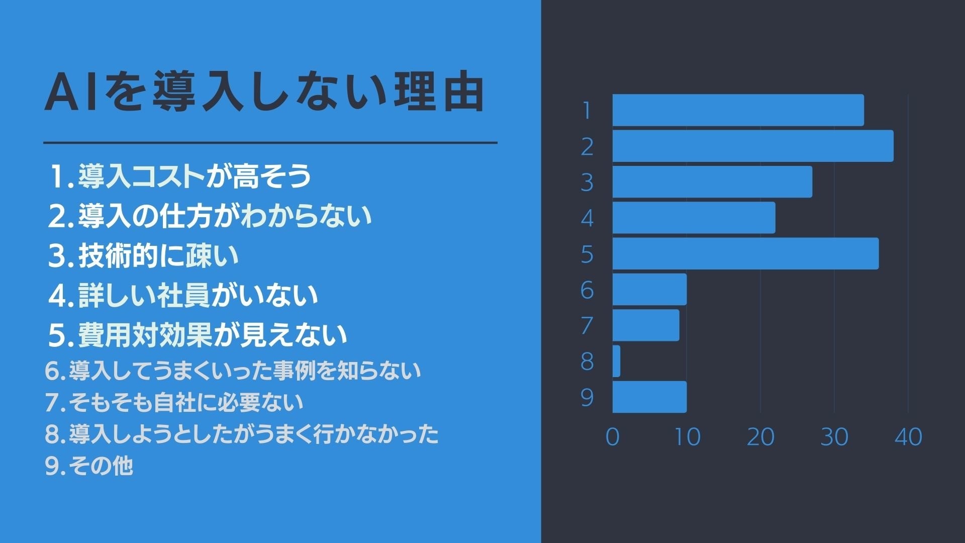 AI後進国と言われ、国を挙げてAI人材の育成に励んでいる日本ですが、まだまだ企業へのAI導入は進んでいない現状があります。日本の企業がIoT・AI等のシステム・サービスを導入しない理由としては、下図の内容が挙げられ、主にAIに関する知識の不足やコスト面の問題が挙げられます。