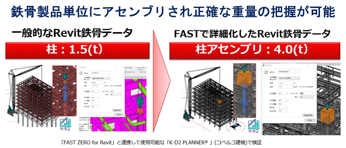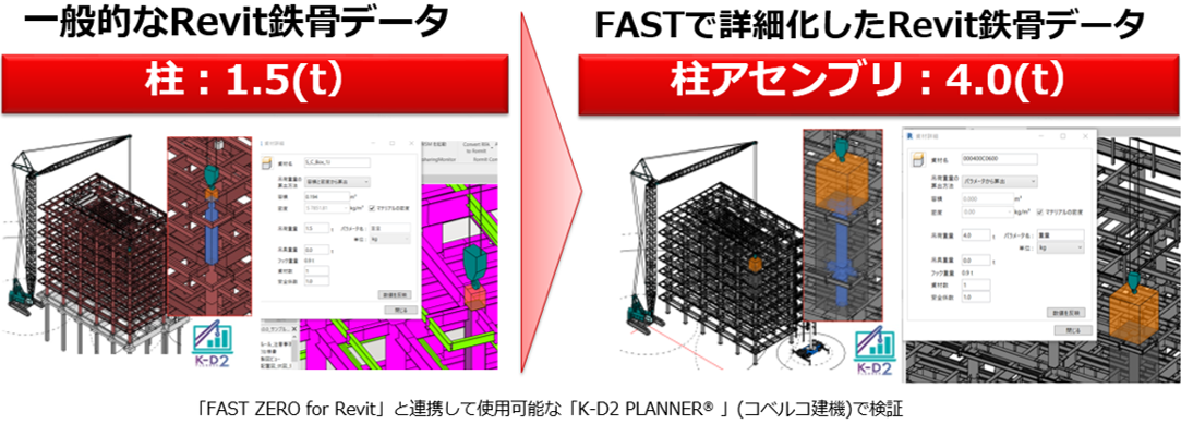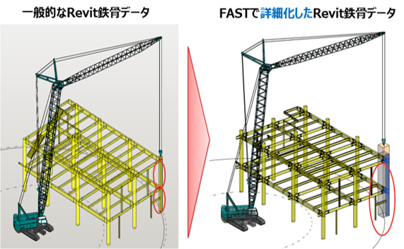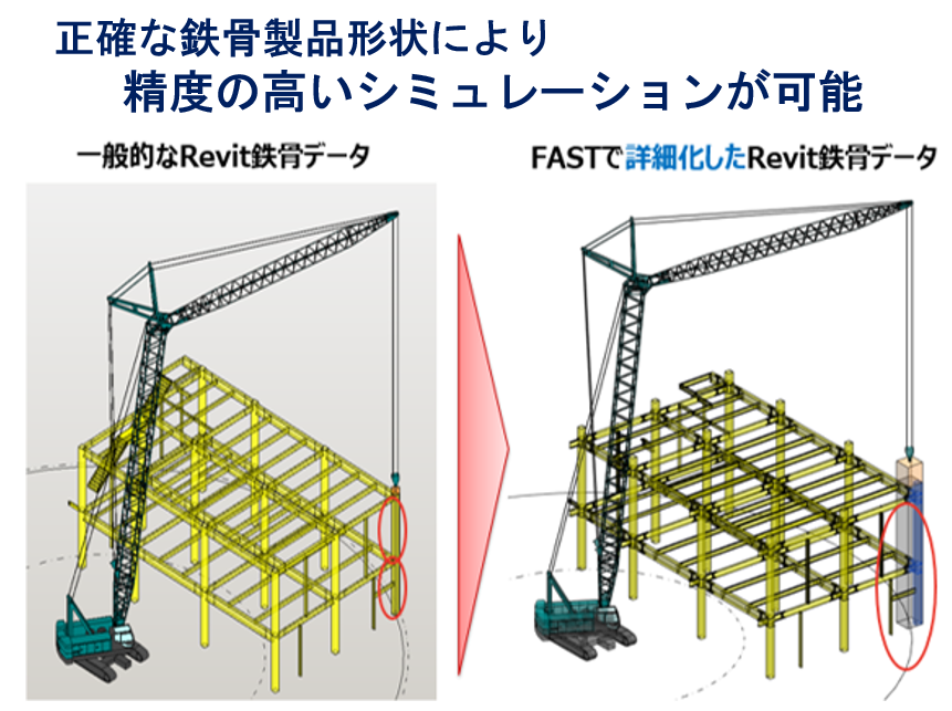 ファーストクルーが展示するRevit鉄骨モデル詳細化ツール「FAST ZERO for Revit」で作成した鉄骨モデルでは、正確な鉄骨重量、製品形状の把握が可能です。さらに、クレーンシミュレーションソフトとの連携ができ、これによって正確な揚重機の選定、またクレーン位置やクレーン姿勢、鉄骨の据え付け準の検討をより現実に近い条件でシミュレーションすることが可能になります。