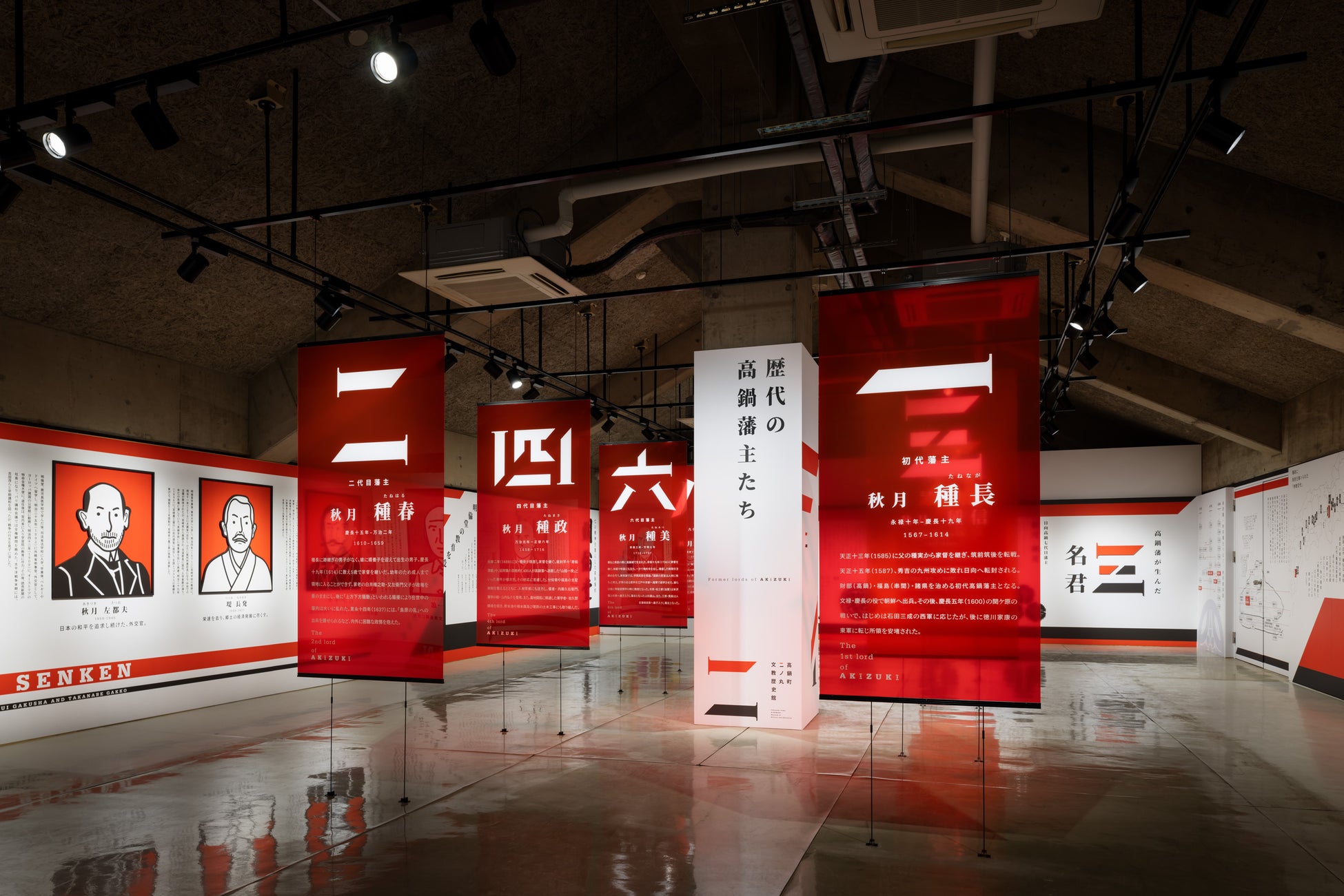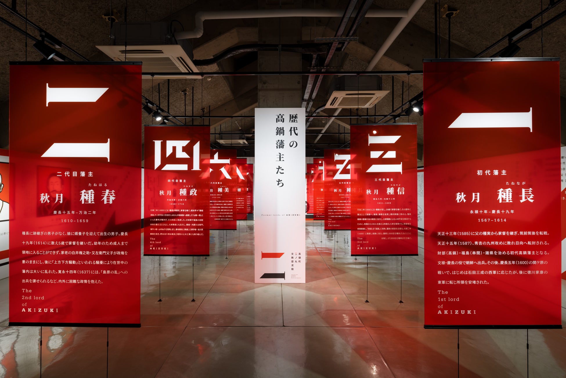 「二ノ丸文教歴史館」は、クリエイティブ・ディレクター梶友宏と、郷土史に詳しい石川正樹氏や清水正恵氏の意見も頂いた上で、高鍋の人づくりの歴史を物語として描き出しました。空間は、赤と黒を基調にした力強くグラフィカルなデザインで表現されています。