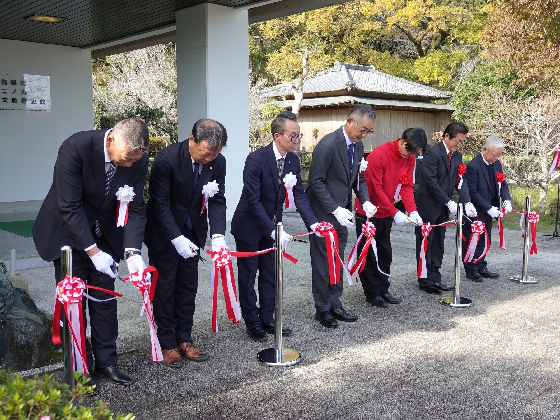 オープンに先立ち12月20日(金)にメディアや関係者に向けて本施設を初公開。黒木敏之高鍋町長を始め、議会議員の皆様や関係者、トモダチ代表の梶友宏が出席し、ここから高鍋町の新しい歴史の一歩を祝いました。歴史と未来が交差する新しい体験を、ぜひ「二ノ丸文教歴史館」でお楽しみください。