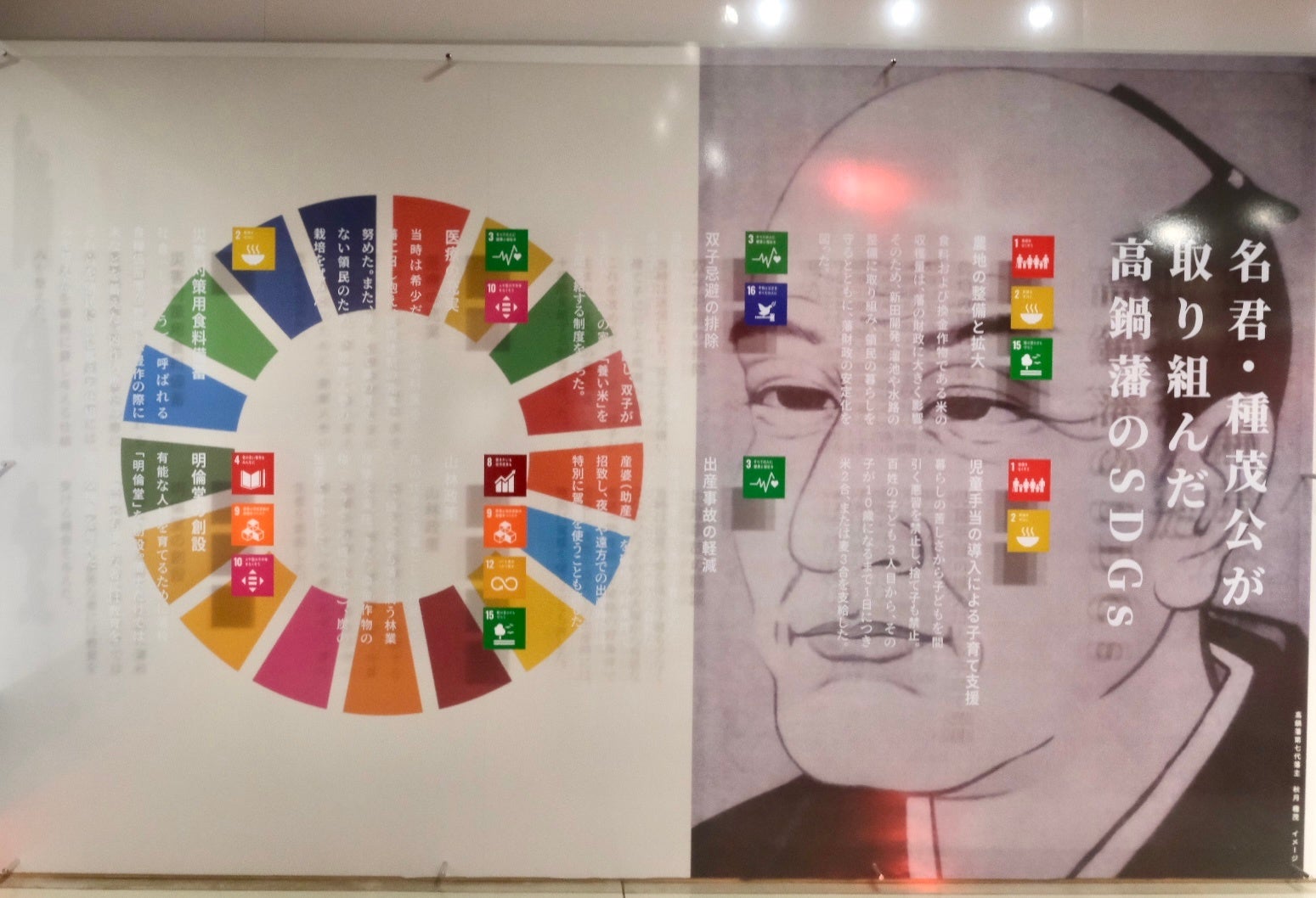 2階の見所として、高鍋藩第七代藩主秋月種茂公が導入した、国内でも早い時代に実施された子育て支援制度や山林政策など、現在のSDGsに通じる政策は、未来をつくるためのヒントを得られる内容となっています。内覧会でも「小学生や若者が自分ごととして楽しみながら学べるように、種茂公の取り組みをSDGs17の目標で表現しました」と梶友宏が説明していました。