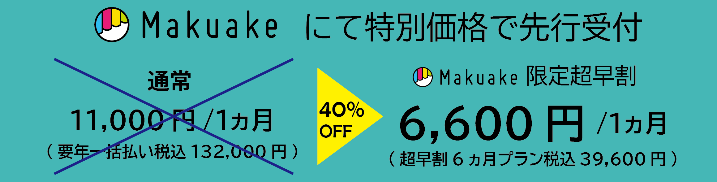 日本での提供開始キャンペーンとして、クラウドファンディングサイト「Makuake」にて先行割引料金[超早割40%引 1ヵ月あたり6,600円]にて新規受付を開始いたしました。