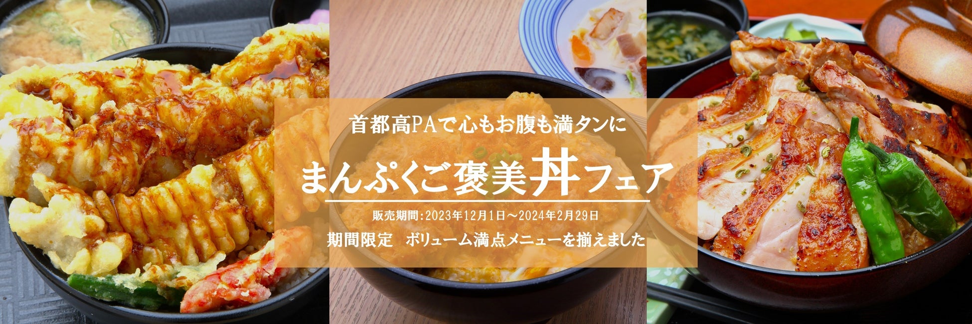 首都高速道路サービス株式会社は、この冬ボリューム満点の贅沢どんぶりを首都高の各PAレストランでお楽しみいただける、「まんぷくご褒美丼フェア」を期間限定で実施します。王道からオリジナルの創作丼まで、PAの個性を活かしたバラエティに富んだメニューは、首都高PAを普段から利用いただくビジネスドライバーのお客様から観光で立ち寄られるお客様まで幅広く楽しんでいただけるものとなっております。各PA対象メニューをご購入いただいたお客様には、「標識ステッカー」をプレゼントします。(ステッカー配布は予定枚数に達し次第、終了となります)