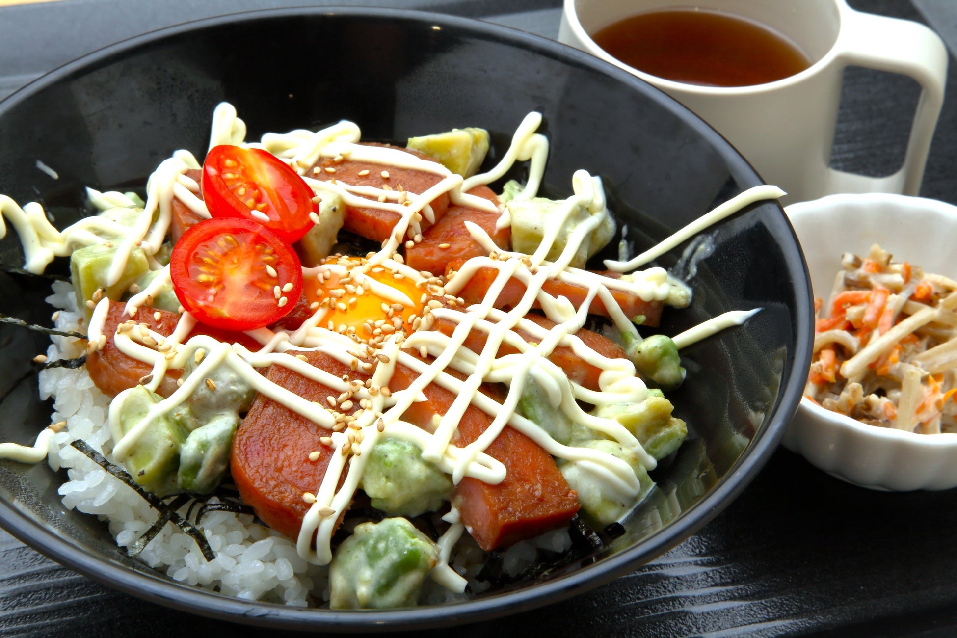 しっかりと味のついたスパムにさっぱりとしたアボカド、濃厚な卵黄が絡み合います。アクセントのミニトマトで彩りも加えました。