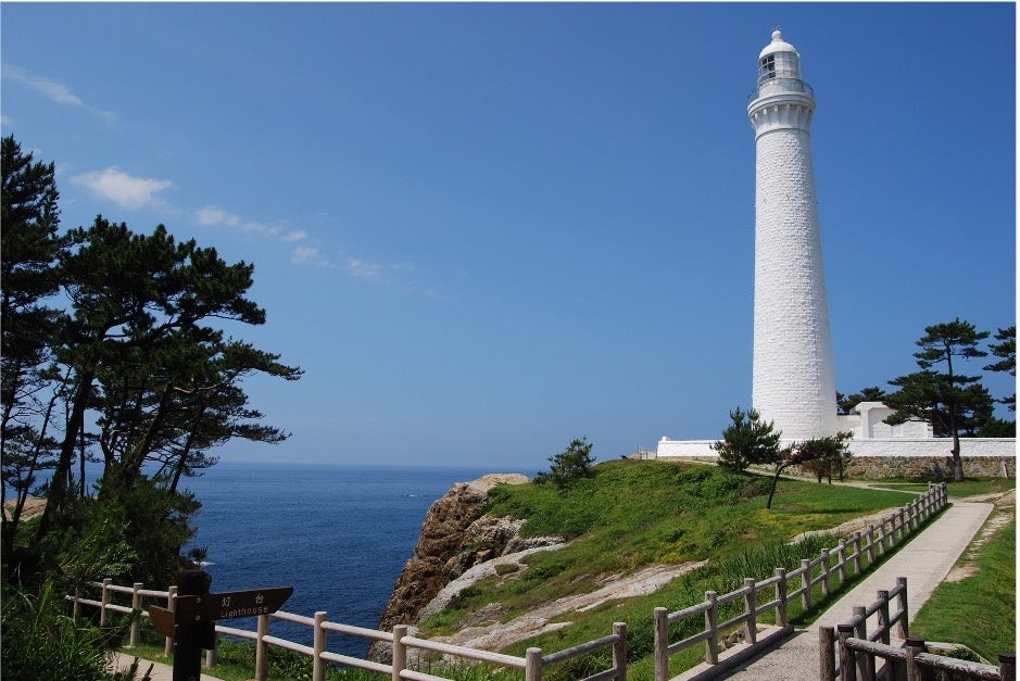 島根半島の最西端の断崖にそびえる「出雲日御碕灯台」。明治36年(1903)に設置されました。海面から灯塔の灯火までは63.30m。地面から塔頂まで(塔高)が43.65mあり、石造灯台としては日本一の高さを誇ります。真っ白な外壁は、松江市美保関町で切り出された硬質の石材、内壁はレンガ造りで、外壁と内壁の間に空間を作った特殊な二重構造になっています。光度は48万カンデラで、夜間は約40km沖合まで達し、100歳を越えた今なお現役で海の安全を守っています。