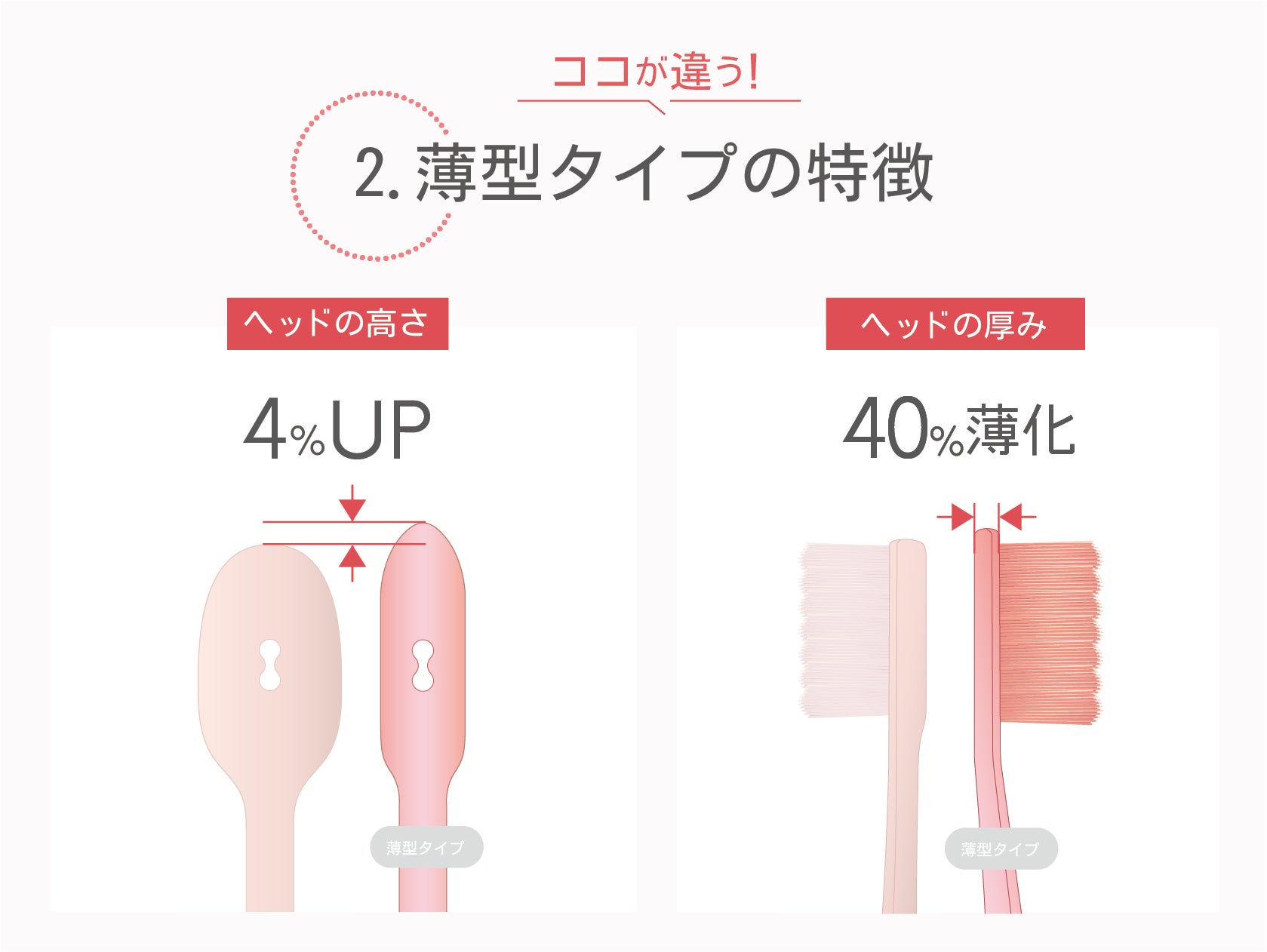 口の中でのヘッドの存在感をできるだけ感じないよう、ブラシ部の厚みを従来比で40%薄くし、幅も細くしました。また、歯ブラシとしては先端がとがっていて、奥歯のウラまでググッと届きます。