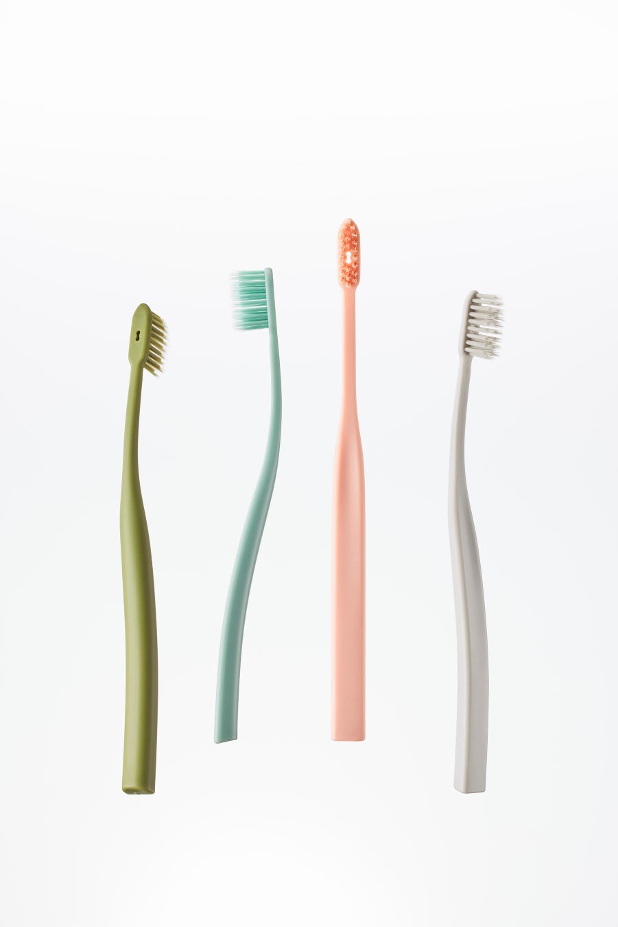 穴あき歯ブラシの最大の特長であるブラシ部の真ん中に開いた穴。合わせて、ブラシ毛と柄が統一されたピンク、ライトグレー、グリーン、ライトブルーの4色。これら全てが坂部ブラシの歯ブラシのアイデンティティとなっています。