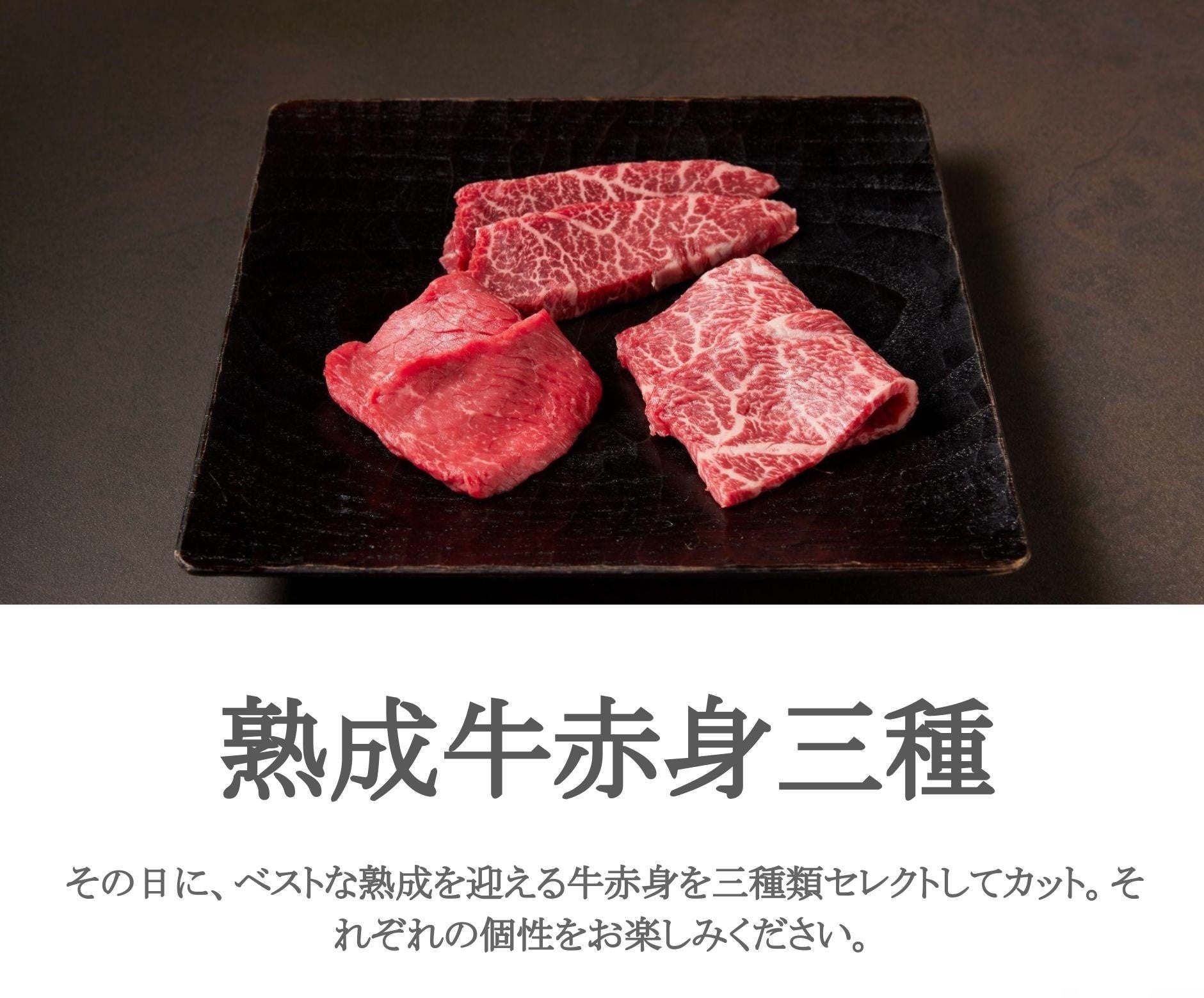 内モモ・マル・ウデ・クリ・スジミスジ等々の部位からその日の熟成加減をみて、選りすぐりの部位を3種チョイスしてます。お肉の状態をみて厚みや柵取りも 変えるため、二度と同じ商品とは出会えない特別な一品です。