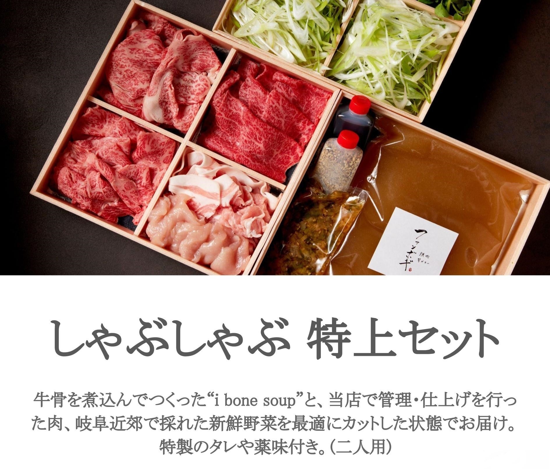 サーロインや、牛ヒレ、タンなどの豪華なお肉を総量500gセットにした、身も心も満足なファンボギ名物セットです。岐阜近郊の著名農家の新鮮野菜と一緒に召し上がりください。 スープは、牛骨を煮込んだスープに、厚削りかつお、煮干し、昆布、椎茸を加えた和風スープです。