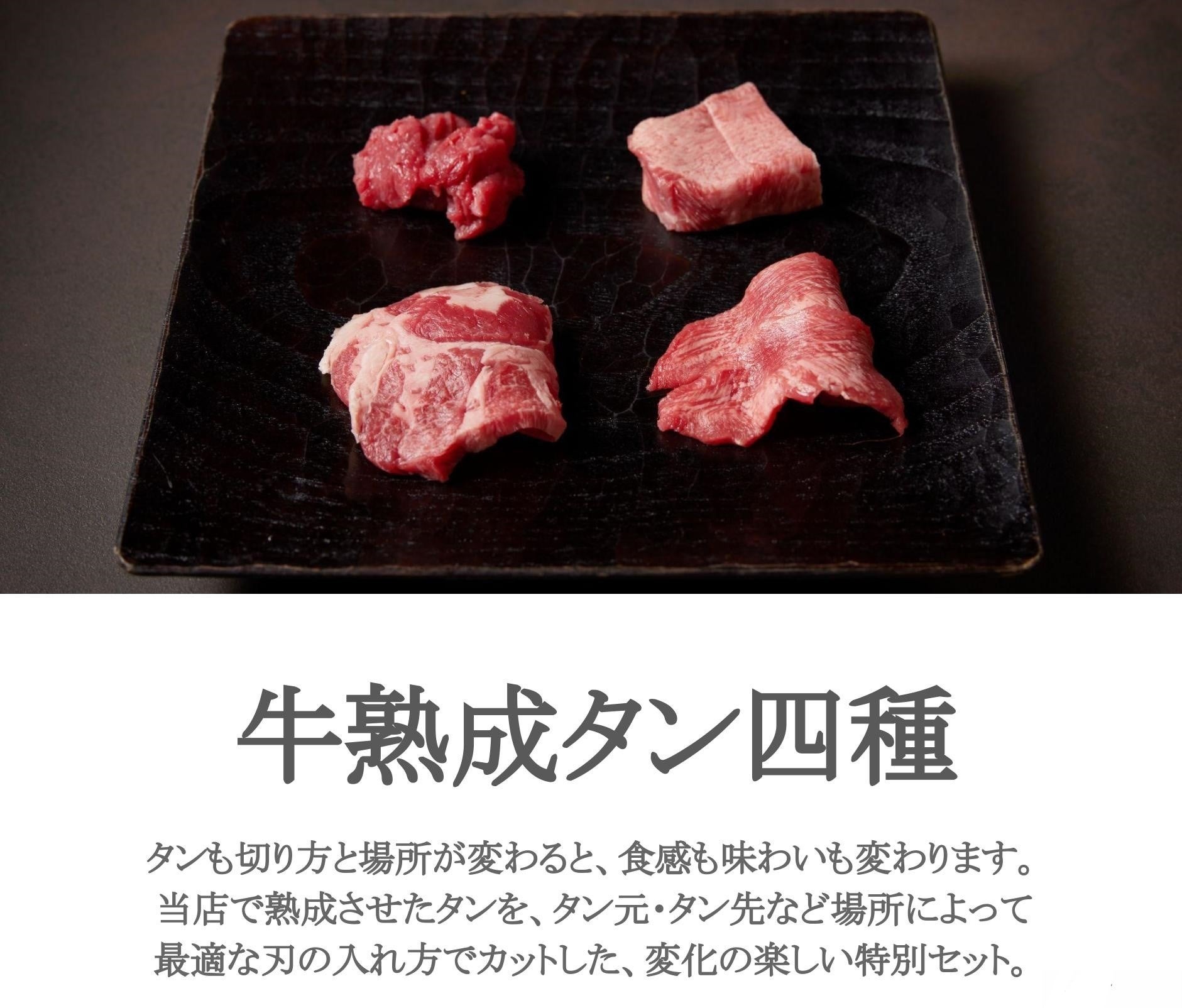 丁寧に熟成させたタンモト、タンスライス、タン先、アゴのセットです。脂がのったジューシーなタンモトから、噛み応えのあるアゴまで、タン各種の違いを味わえる、ファンボギだけの牛タンセットです。