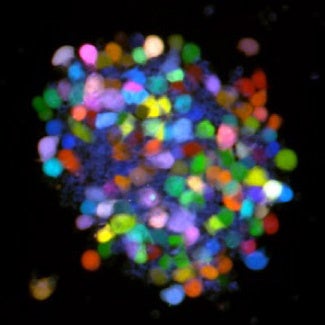 色の三原色である赤、緑、青色の3種類の蛍光タンパク質を同時に細胞に導入して、個々の細胞を異なる蛍光色でラベルする方法。