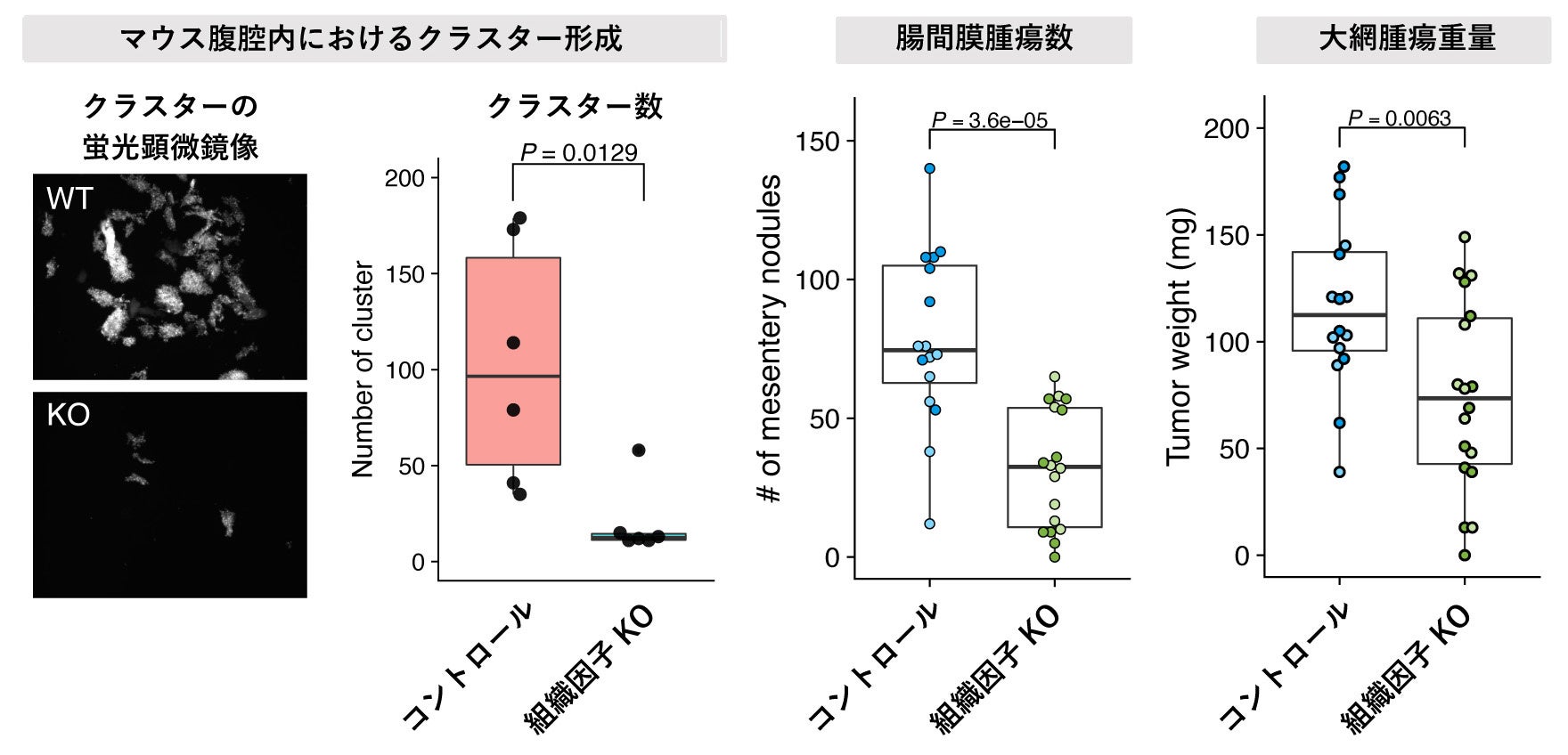 コントロールおよび組織因子をノックアウト(KO)した胃がん細胞をマウスに移植した。組織因子をノックアウトした細胞では、クラスターの数が減少し、腹膜播種(腸管膜や大網への転移)が顕著に抑制された。