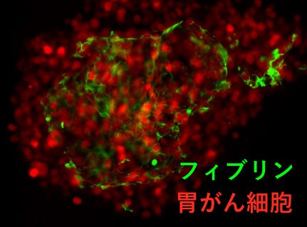 マウス腹腔内で形成された胃がん細胞(赤)のクラスター。フィブリン繊維(緑)が形成され、がん細胞同士をつなぎ合わせている様子が観察された。
