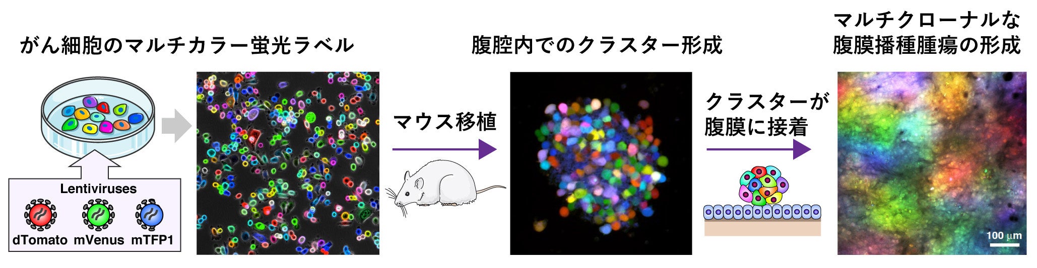 赤、緑、青の蛍光タンパク質を同時に胃がん細胞に導入し、個々の細胞を異なる蛍光色でラベルした。この細胞をマウスに移植し腹膜播種を誘導した。腹膜播種の腫瘍は1色ではなく複数の蛍光色を呈していた。また移植後の腹腔内にはがん細胞のクラスターが多数存在していた。従って、がん細胞は腹腔内でクラスターを形成し、集団で腹膜に接着してマルチクローナルな腫瘍を形成すると考えられた。