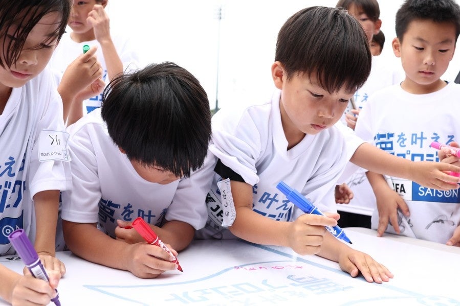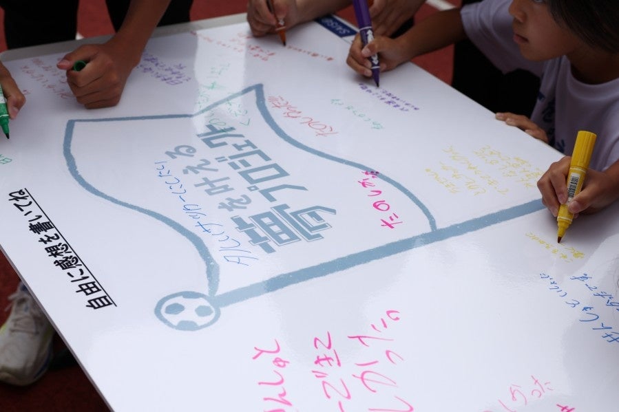 イベントの最後には、参加した子どもたちがそれぞれの感想や夢をボードに書き込みました。「短い時間だったけど最高に楽しかった」「藤田選手とサッカーができてうれしかった」など、カラフルなメッセージが溢れるボードには、子どもたちの笑顔と熱い想いがあふれていました。この特別な一日が、未来に向けた一歩となり、それぞれの夢を叶えるきっかけになることを願っています。