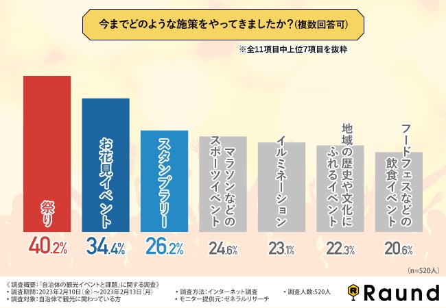 「今までどのような施策をやってきましたか?(複数回答可)」と質問したところ、『祭り(40.2%)』と回答した方が最も多く、次いで『お花見イベント(34.4%)』『スタンプラリー(26.2%)』と続きました。