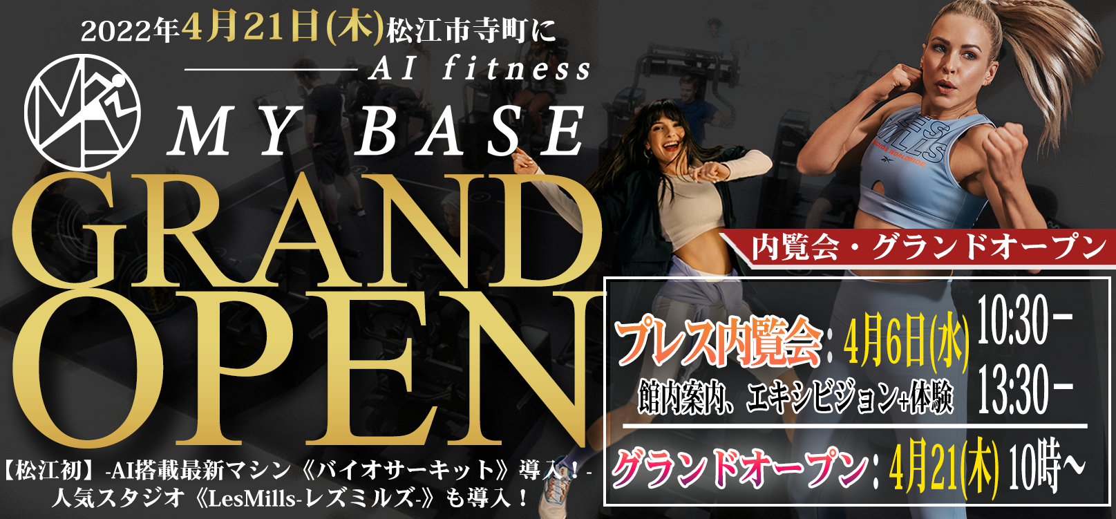 松江初のAI管理で効率良くトレーニングができる最新マシン「バイオサーキット」と⼭陰初の24時間いつでもスタジオプログラムが楽しめる「バーチャルスタジオ《LesMills》レズミルズ」を完備した、地域初の24時間ジム「AI fitness MYBASE (AIフィットネス マイベース)」を2022年4月21日(木)グランドオープンします!