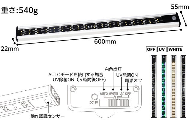 - スイッチ:4種類(AUTOモード、白色点灯、UV除菌ON、電源オフ)