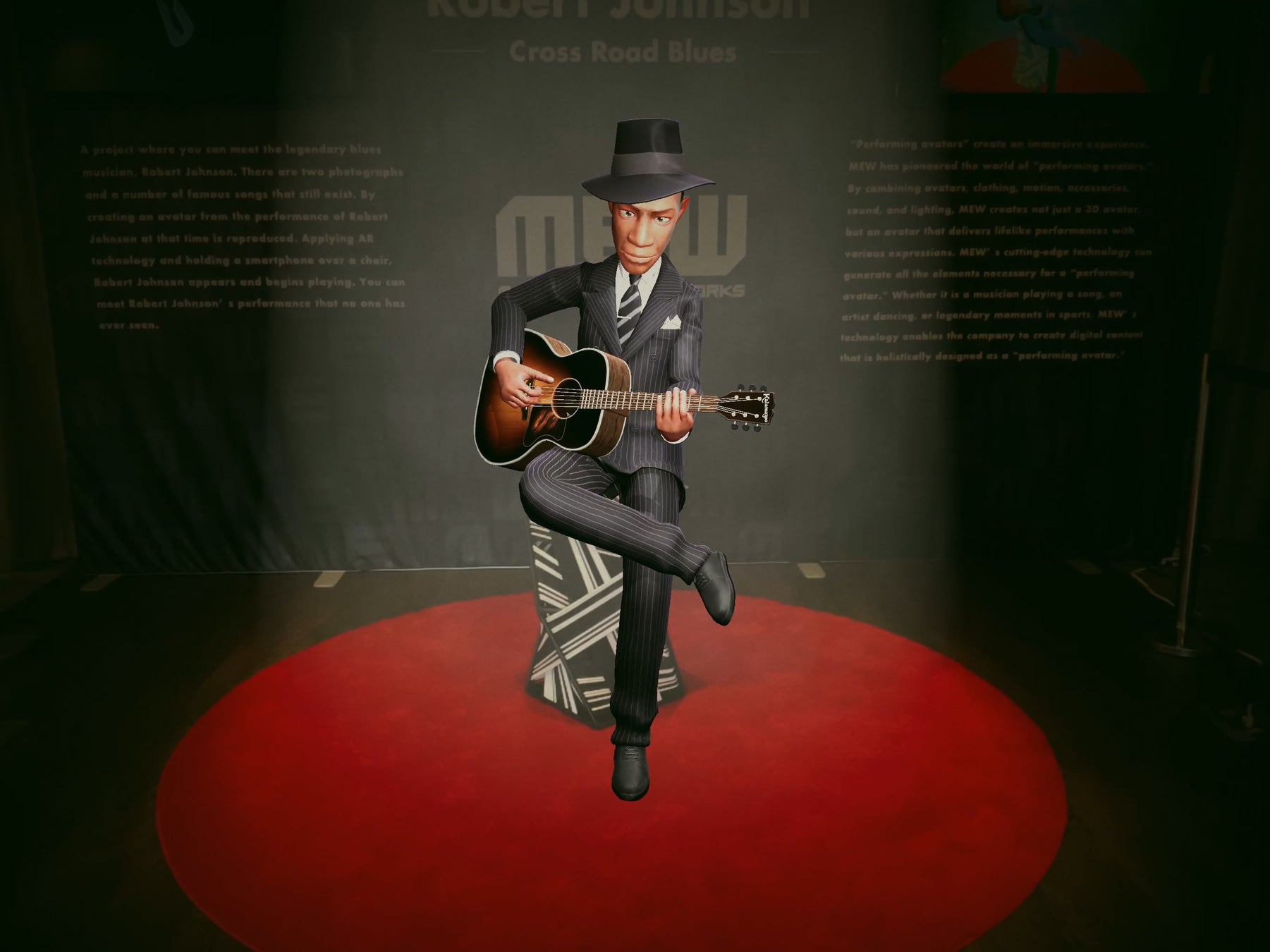 レッドカーペットの上に置かれたモノクロの椅子にスマートデバイスをかざすと、そこにはGRAMMYsのステージさながら、スポットライトを浴びたロバート・ジョンソンが登場。「クロスロード伝説」の元となった伝説の曲、「クロスロード ブルース」を演奏するエンターテイメントショーが始まります。