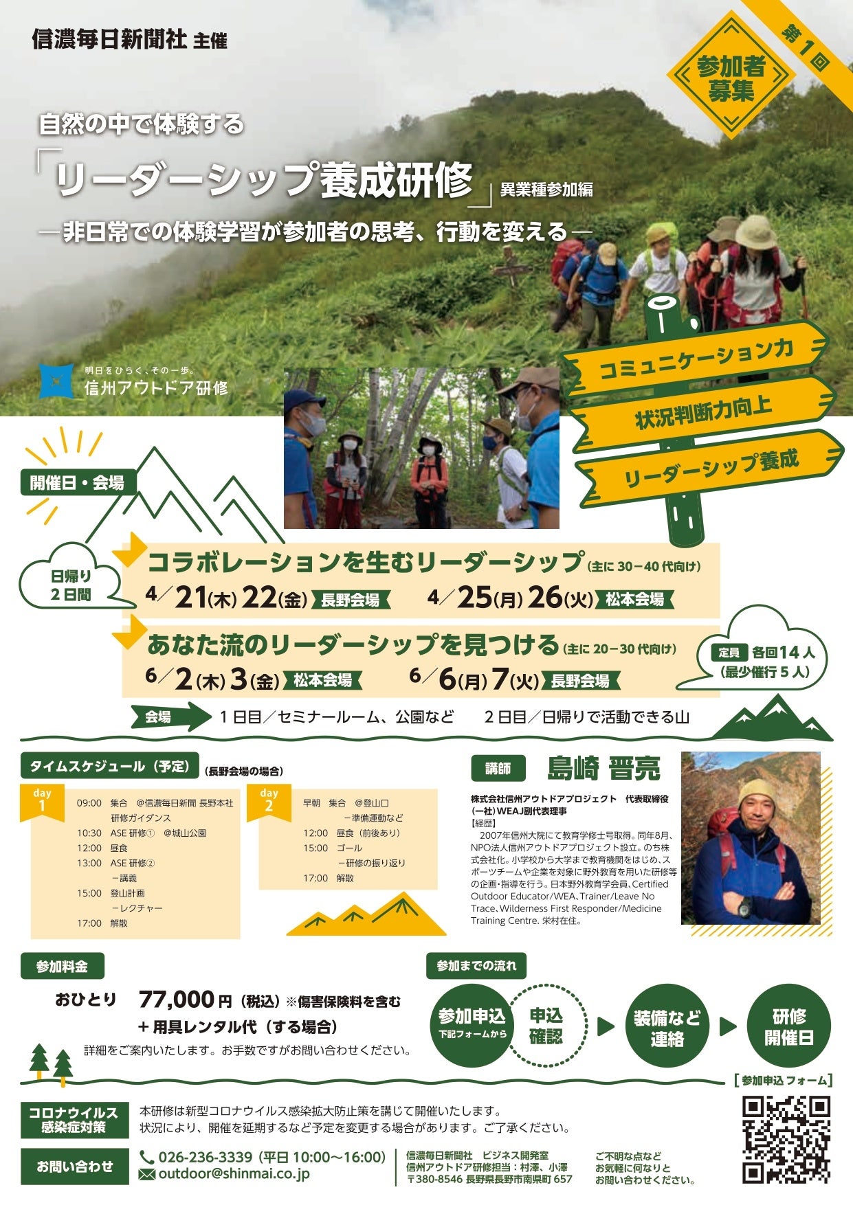 信州大大学院で教育学修士号(野外教育)を取得した島崎晋亮氏らが2007年、NPO法人信州アウトドアプロジェクトを設立。18年に株式会社化。教育機関やスポーツチーム、企業を対象に野外教育の理論を用いた研修等の企画・指導を行う。
