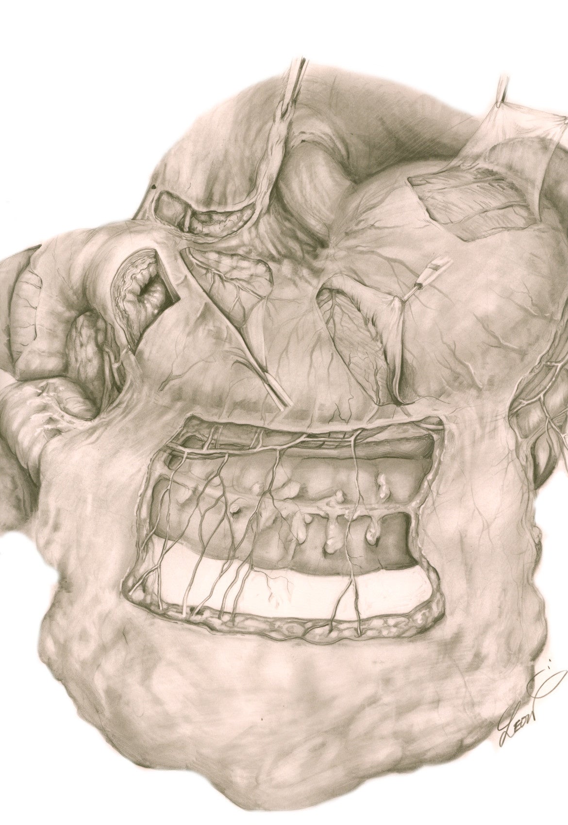 レオン佐久間の代名詞ともいえる「消化器外科手術アトラス」( 月刊『消化器外科』;へるす出版)に掲載されたイラストなど、数々の原画を集めての展示は今回が初。医療従事者の方はもちろん、メディカルイラストレーションに興味のある方やこれから医療従事者を目指す方など、実用に主眼を置いたメディカルイラストレーションの迫力と美しさをぜひとも体験しにいらしてください。