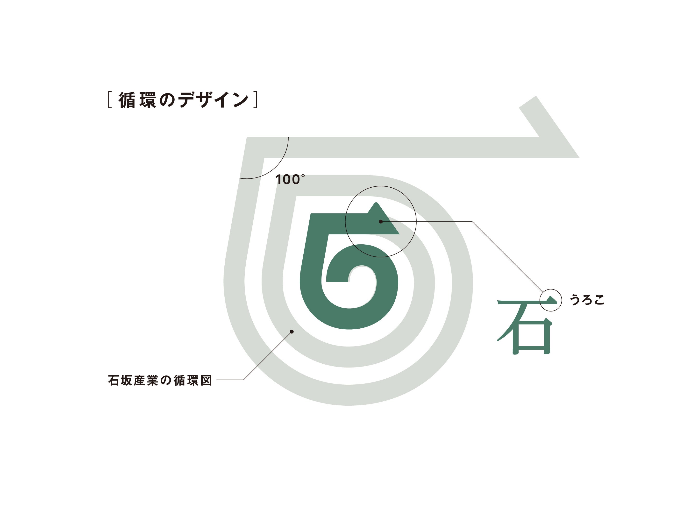 循環を円状の輪で表現することがよくあるのですが、私は以前から、同じ ところに戻る輪の表現に違和感を覚えていたこともあり、同じところには 戻らない循環、つまりスパイラルの表現に石坂産業の「石」の漢字を重ね マークとしました。右上の明朝体の「うろこ」にあたる部分を矢印にし、回 転(循環)しながら角も曲がり先へ向かっていく石坂産業の強い意志を、そこに表現しています。